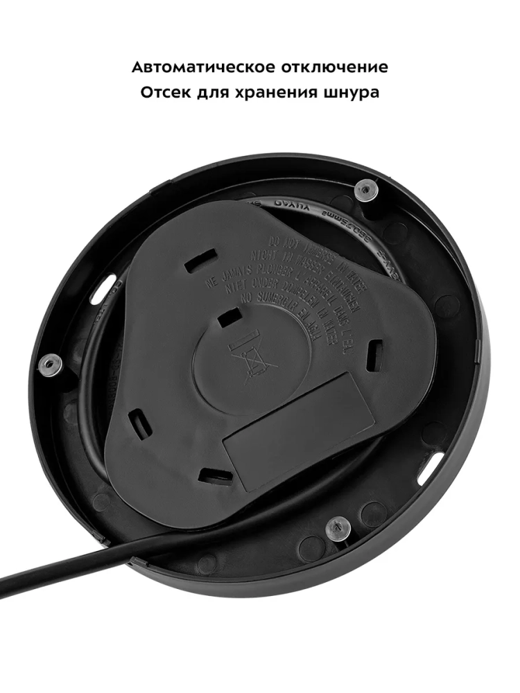 Подставка с центральным контактом дает возможность располагать на ней чайник в любом положении, обеспечивая вращение на 360°. Снизу имеется отсек для хранения шнура, в который можно смотать излишки шнура электропитания, чтобы он не мешал на столе.