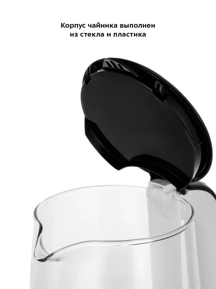Корпус чайника выполнен из стекла и пластика. Мерная шкала нанесена на стеклянную часть корпуса. Ручка чайника пластиковая, не нагревается и удобно лежит в руке. При включении чайника загорается подсветка около дна прибора, которая является индикатором работы.