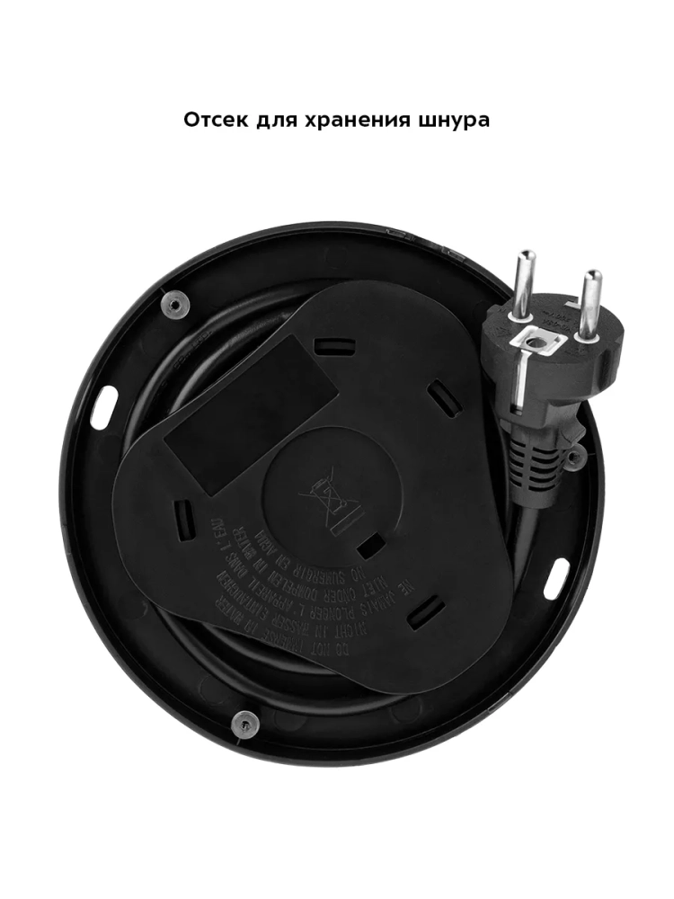 Подставка с центральным контактом дает возможность располагать на ней чайник в любом положении, обеспечивая вращение на 360°. Снизу имеется отсек для хранения шнура, в который можно смотать излишки шнура электропитания, чтобы он не мешал на столе.