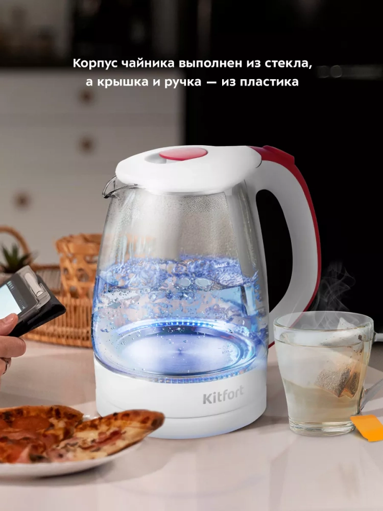 Корпус чайника выполнен из стекла. Крышка и подставка выполнены из пластика. Мерная шкала находится на стеклянном корпусе чайника. Ручка чайника пластиковая, не нагревается и удобно лежит в руке.