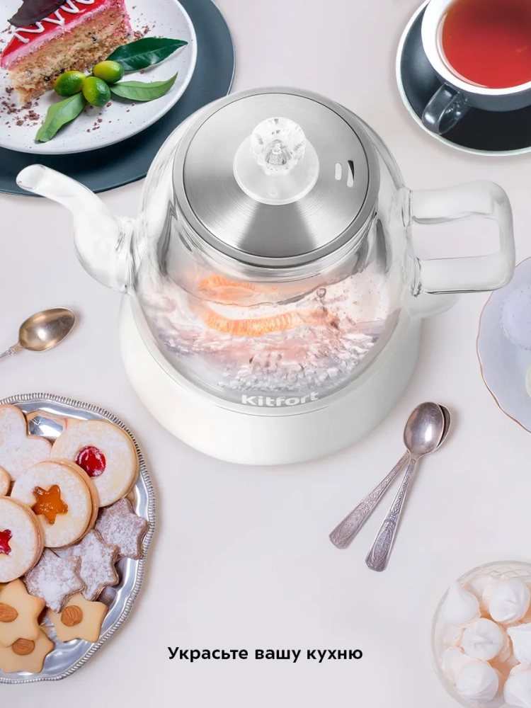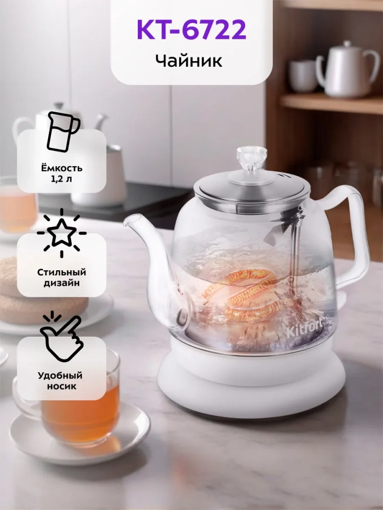 Электрический чайник Kitfort КТ-6722 предназначен для кипячения воды дома, в офисе, на даче. Емкость чайника всего 1,2 л, он прекрасно подойдет небольшим семьям.