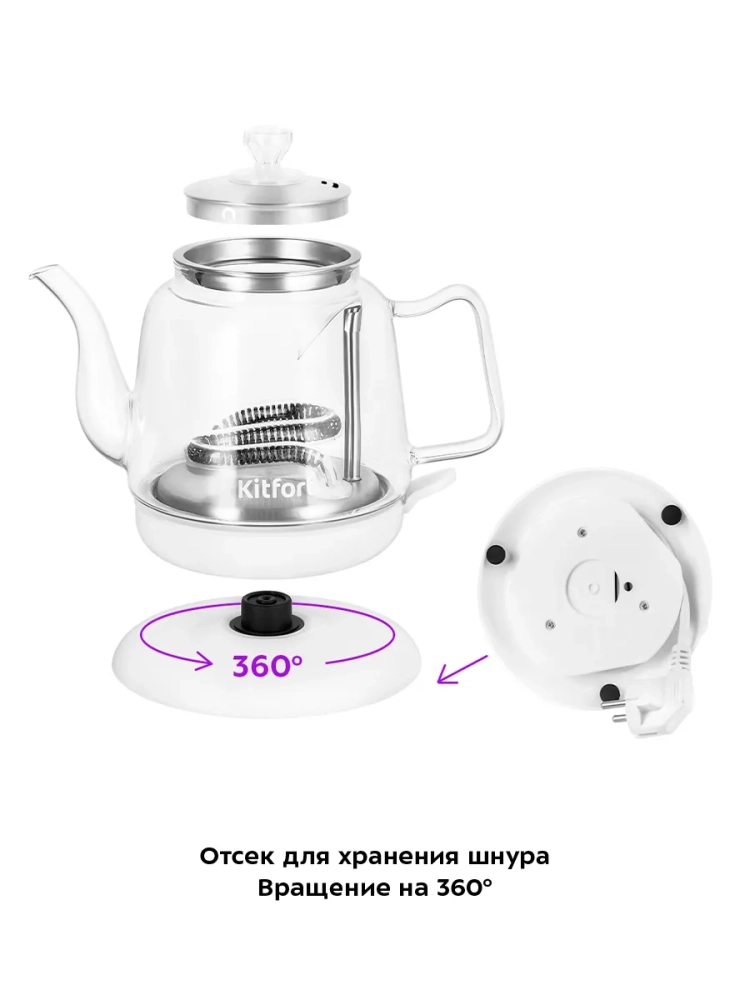Подставка с центральным контактом дает возможность располагать на ней чайник в любом положении, обеспечивая вращение на 360°. Снизу имеется отсек для хранения шнура, в который можно убрать излишки шнура электропитания, чтобы он не мешал на столе.