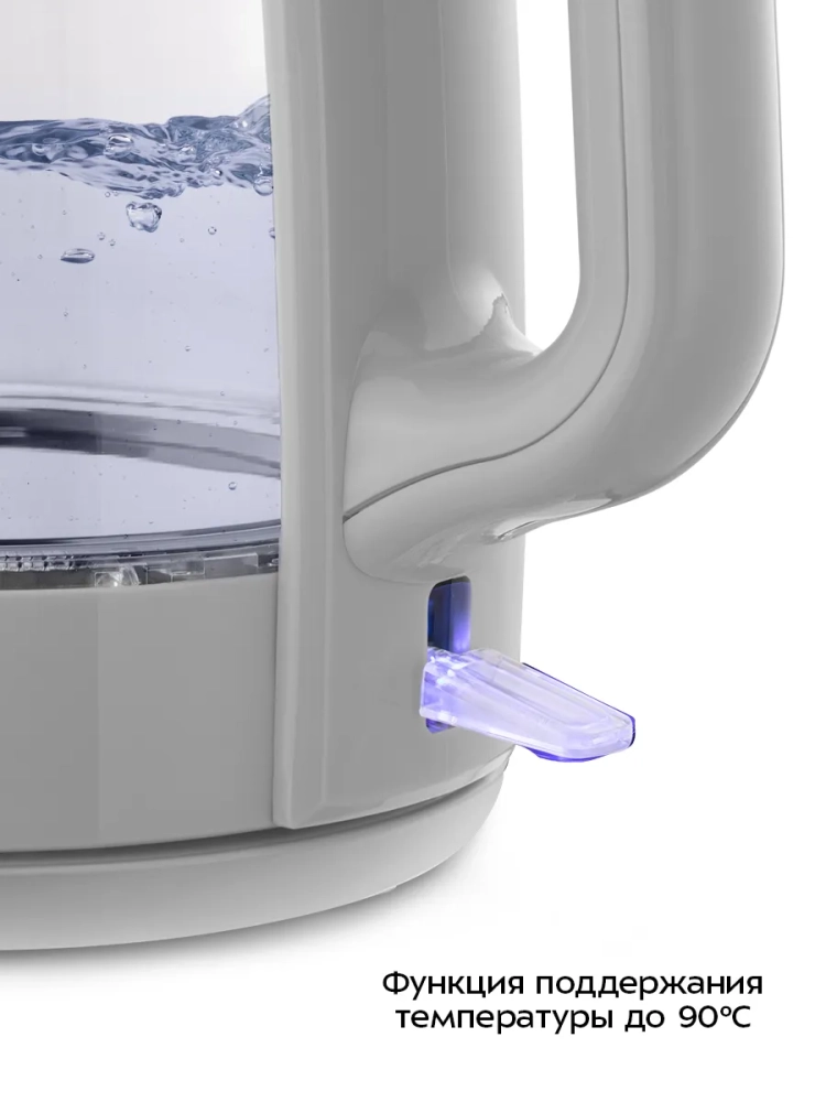 Кипячение воды включается при помощи переключателя, расположенного на ручке чайника. Поддержание температуры включается при помощи кнопки, расположенной внизу корпуса. При включении чайника загорается подсветка у дна прибора. При включении поддержания температуры загорается индикатор кнопки.