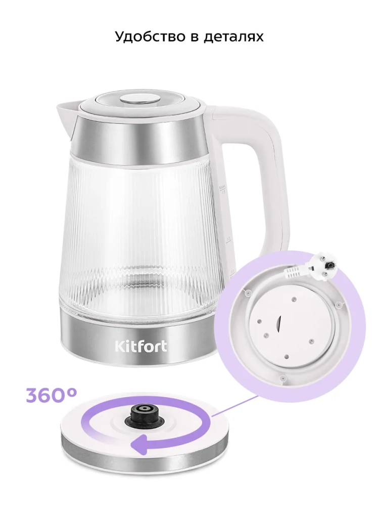 Электрооборудование Kitfort характеризуется энергосберегающими технологиями, что делает использование чайника экономичным. Белый цвет корпуса гармонично сочетается с любым интерьером. На рынке электроизделий эта модель выделяется благодаря своему стильному и современному дизайну.