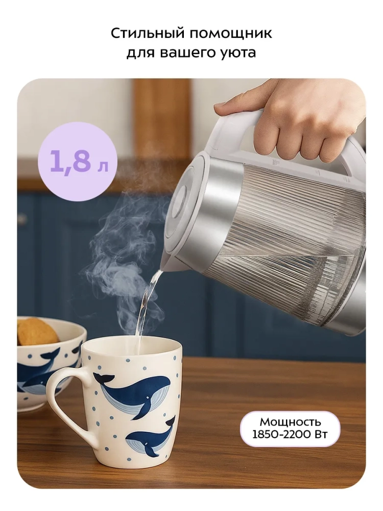 Чайник электрический Kitfort KT-8709 объёмом 1.8 л — это идеальное сочетание стильного дизайна и передовых технологий. Этот стеклянный электрический чайник впечатляет своими функциональными возможностями. Прозрачное стекло корпуса позволяет наблюдать за процессом кипячения, что добавляет эстетического удовольствия от использования.