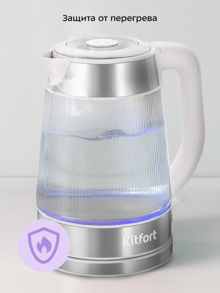 Электрочайник оснащён функцией автоматического отключения при закипании, что обеспечивает безопасность в использовании. Температура нагрева контролируется встроенной системой, что делает чайник более надежным. Kitfort — выбор настоящих ценителей качества.