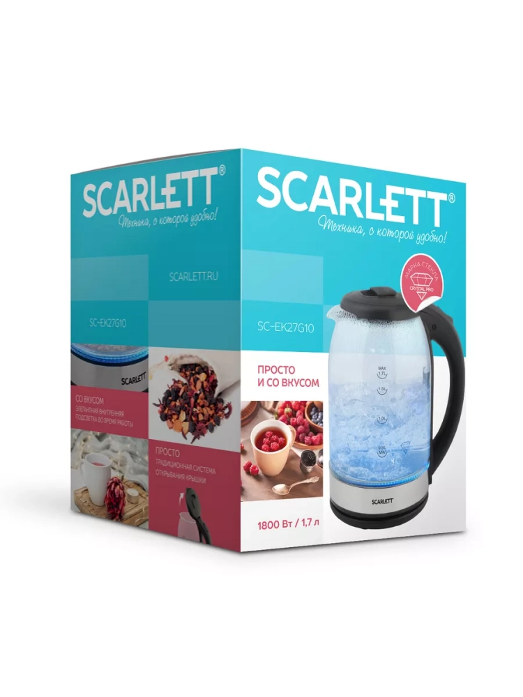 Scarlett SC-EK27G10 – электрический чайник мощностью 1800 Вт и объемом 1.7 л оснащён традиционной системой открывания крышки. Эргономичная ручка и закрытый нагревательный элемент сделают эксплуатацию прибора еще проще и комфортнее. Внутренняя подсветка позволит наблюдать за завораживающим процессом кипячения.