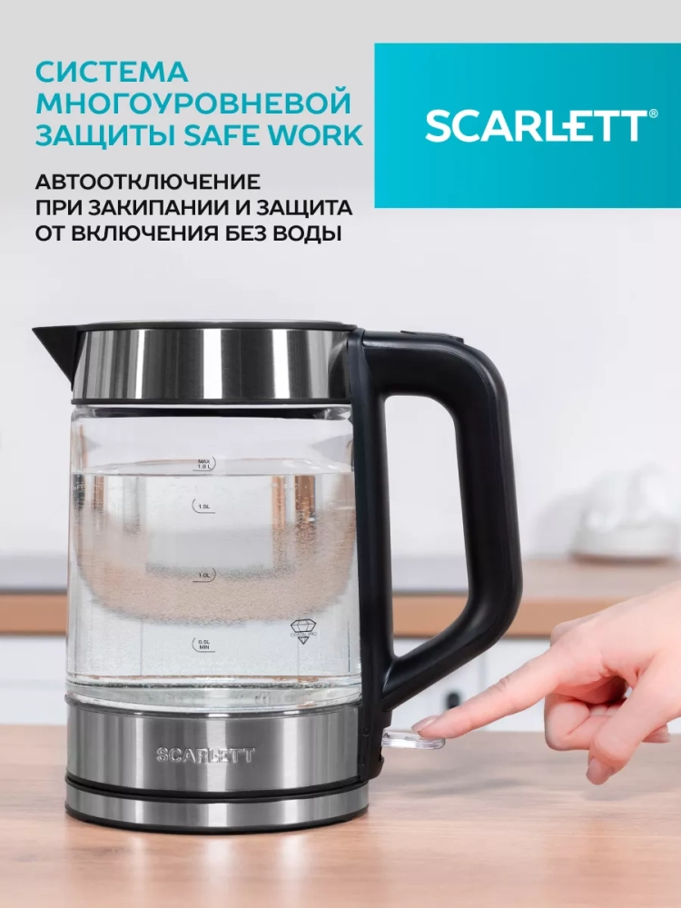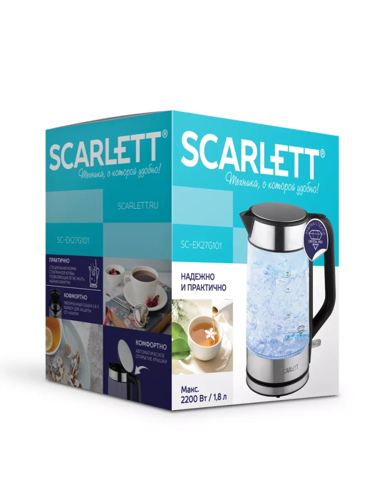 Электрический чайник SC-EK27G101 с увеличеннымобъемом 1.8 л оснащён автоматической системой открытия крышки.Эргономичная ручка, закрытый нагревательный элемент сделают эксплуатацию прибора еще проще и комфортнее.Нейлоновый фильтр предотвратит попадание накипи в напиток.Классическое цветовое сочетание элементов позволит прибору вписаться в интерьер кухни!