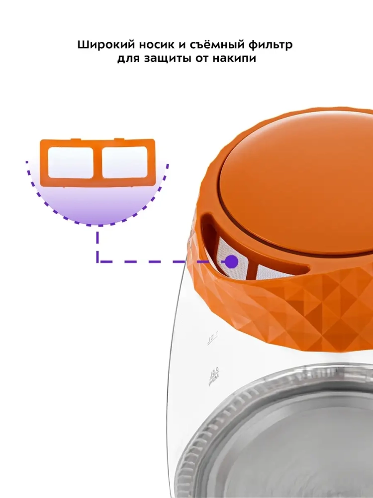 Чайник автоматически отключается при закипании, имеет защиту от перегрева и от включения без воды. В носике чайника расположен съемный фильтр от накипи.