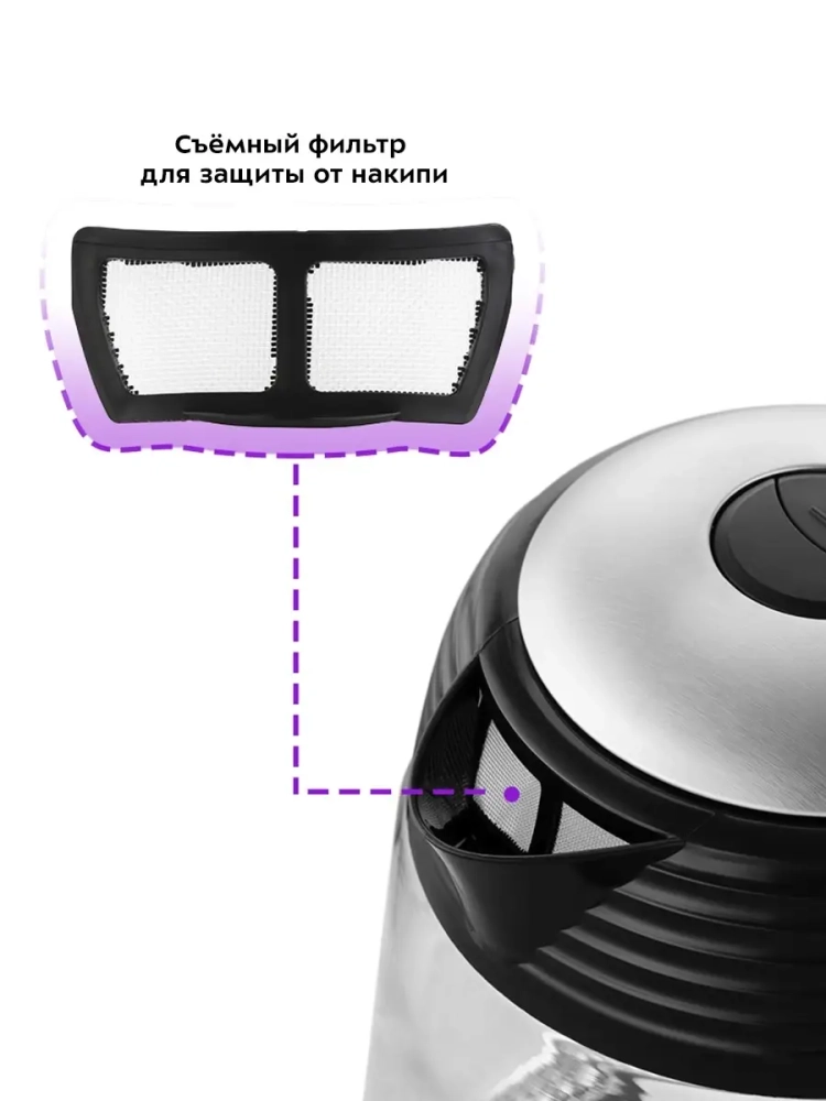 Нагревательный элемент (ТЭН) у этой модели чайника скрытый и находится в донной части. Сверху он закрыт специальной металлической пластиной из нержавеющей стали, благодаря которой исключается прямой контакт ТЭНа с водой. Такая конструкция препятствует образованию накипи, облегчает уход и значительно снижает шум при нагревании воды.