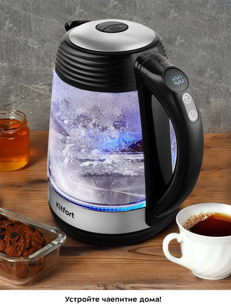 Электрический чайник с электронным терморегулятором Kitfort КТ-6126 может не только вскипятить воду, но и нагреть ее до температур: 40, 50, 60, 70, 80, 90, и 100 °С, что очень удобно при заваривании различных сортов чая. Температура 40 °С удобна для приготовления детского питания. Чайник также оснащен функцией поддержания температуры. Температура воды контролируется встроенным в дно чайника термодатчиком.
