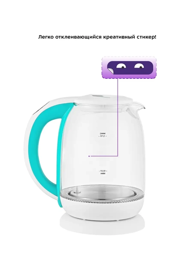 Корпус чайника выполнен из стекла, а крышка и подставка — из пластмассы. Мерная шкала нанесена на прозрачную часть корпуса. Крышка чайника открывается при нажатии на кнопку. Ручка чайника пластиковая, не нагревается и удобно лежит в руке. На ручке расположены кнопки выбора режимов работы и световые индикаторы.