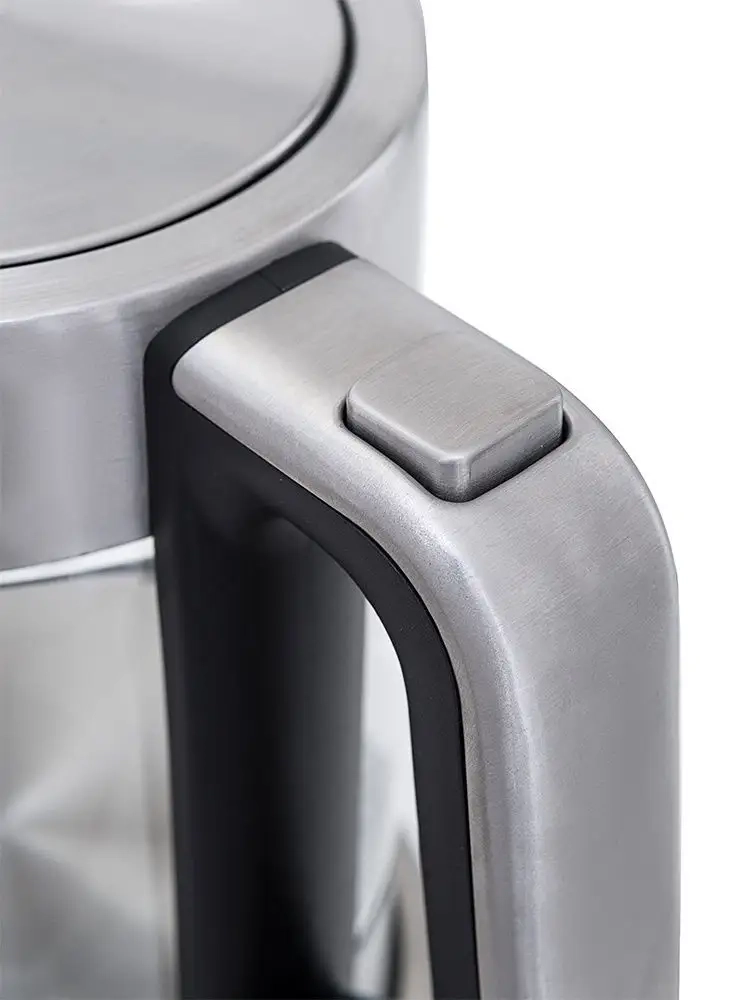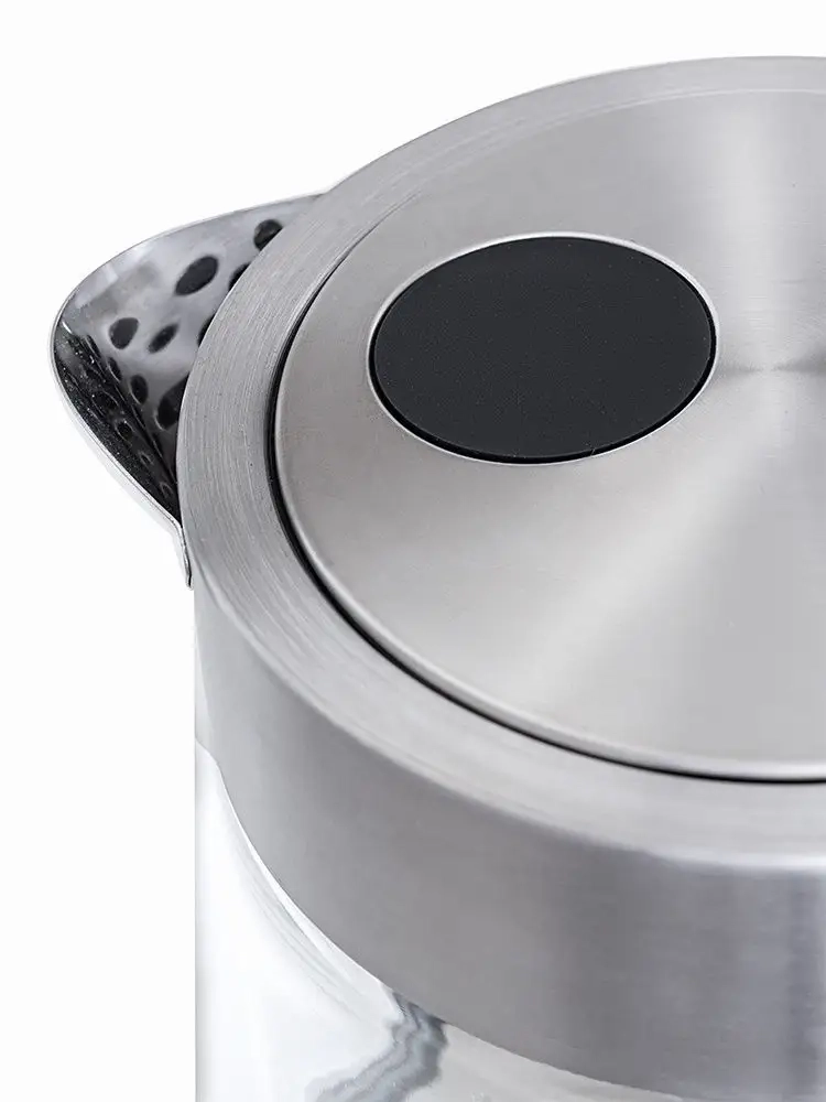 Корпус чайника выполнен из стекла, а крышка и подставка — из сочетания пластмассы и нержавеющей стали. Мерная шкала нанесена на прозрачную часть корпуса. Большое горлышко чайника облегчает доступ внутрь при его мойке и во время удаления накипи. Ручка чайника пластиковая, не нагревается и удобно лежит в руке. Кнопка открывания крышки расположена сверху на ручке. При включении чайника загорается синяя подсветка, которая является индикатором работы и художественно подсвечивает кипящую воду.