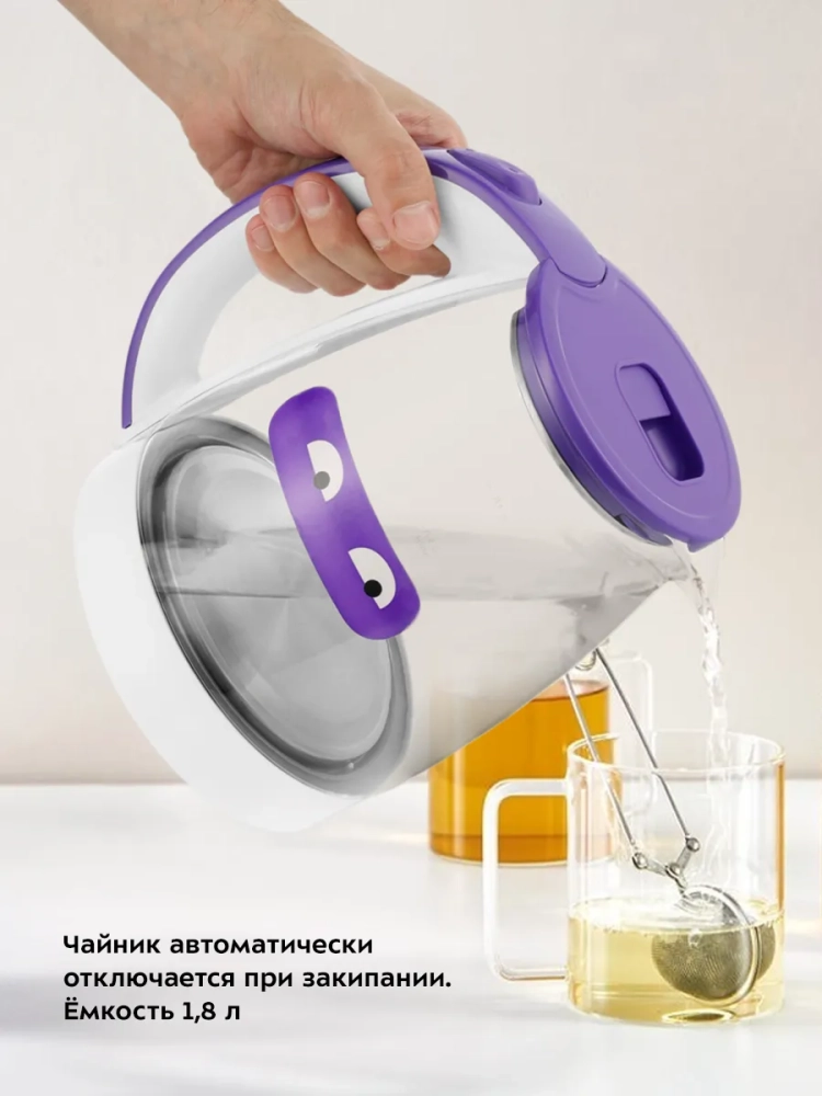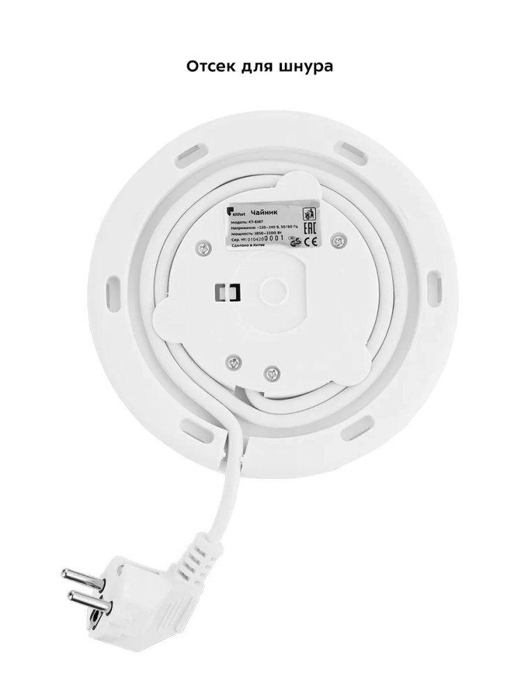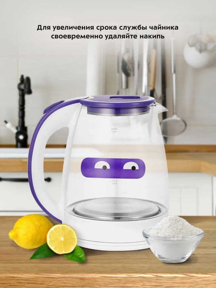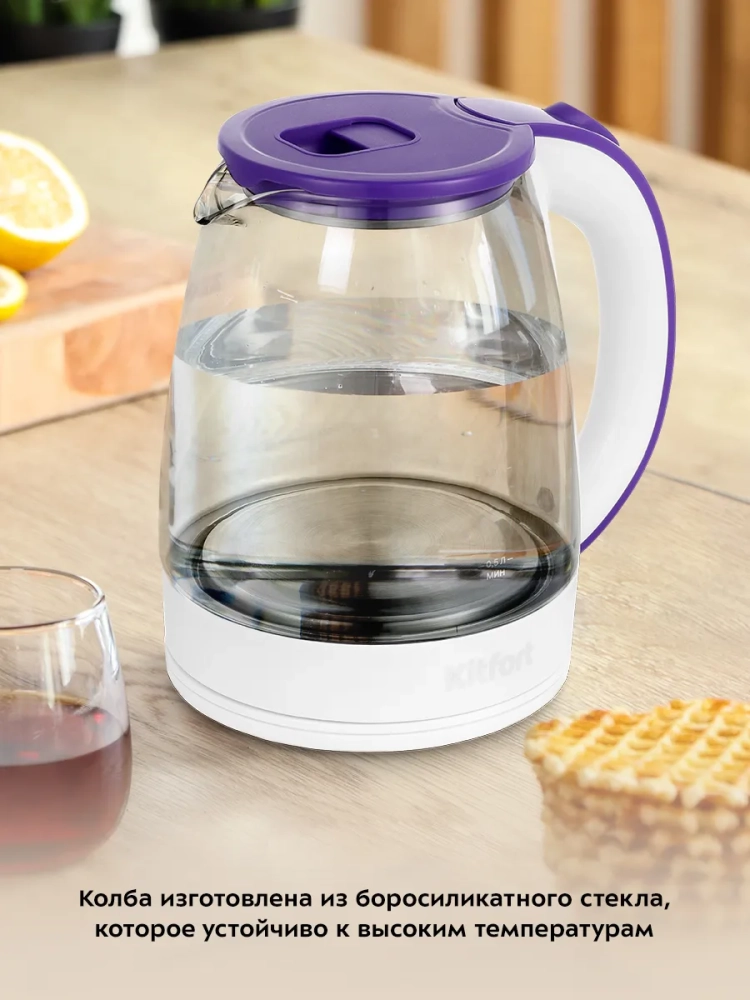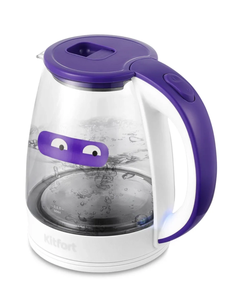 Электрический чайник Kitfort КТ-6167 предназначен для кипячения воды дома, в офисе, на даче. Корпус чайника выполнен из стекла и пластика. Колба изготовлена из боросиликатного стекла, которое устойчиво к высоким температурам. Крышка выполнена из сочетания пластика и металла, а подставка - из пластмассы. Мерная шкала находится на стеклянном корпусе чайника. Ручка чайника пластиковая, не нагревается и удобно лежит в руке. Внутренняя поверхность чайника состоит из стекла и металла, благодаря чему вода не соприкасается с пластиком. Кнопка открывания крышки расположена на крышке, а кнопка включения - на ручке. При включении чайника загорается индикатор работы в нижней части корпуса за ручкой. Нагревательный элемент (ТЭН) у этой модели чайника скрытый и находится в донной части. Сверху он закрыт специальной металлической пластиной из нержавеющей стали, благодаря которой исключается прямой контакт ТЭНа с водой. Такая конструкция препятствует образованию накипи, облегчает уход и значительно снижает шум при нагревании воды. Подставка с центральным контактом дает возможность располагать на ней чайник в любом положении, обеспечивая вращение на 360°. Снизу имеется отсек для хранения шнура, в который можно смотать излишки шнура электропитания, чтобы он не мешал на столе. Полный чайник закипает за 8 минут. Чайник автоматически отключается при закипании, имеет защиту от перегрева и от включения без воды. При закипании воды образующийся пар попадает в паропровод, проходит по нему и затем воздействует на термодатчик, который отключает чайник. Такая конструкция позволяет чайнику отключаться при закипании воды независимо от альтитуды (высоты над уровнем моря). Как известно, атмосферное давление уменьшается с увеличением высоты над уровнем моря, а температура кипения воды, в свою очередь, зависит от давления, так что высоко в горах вода может закипать уже при 80 °С.