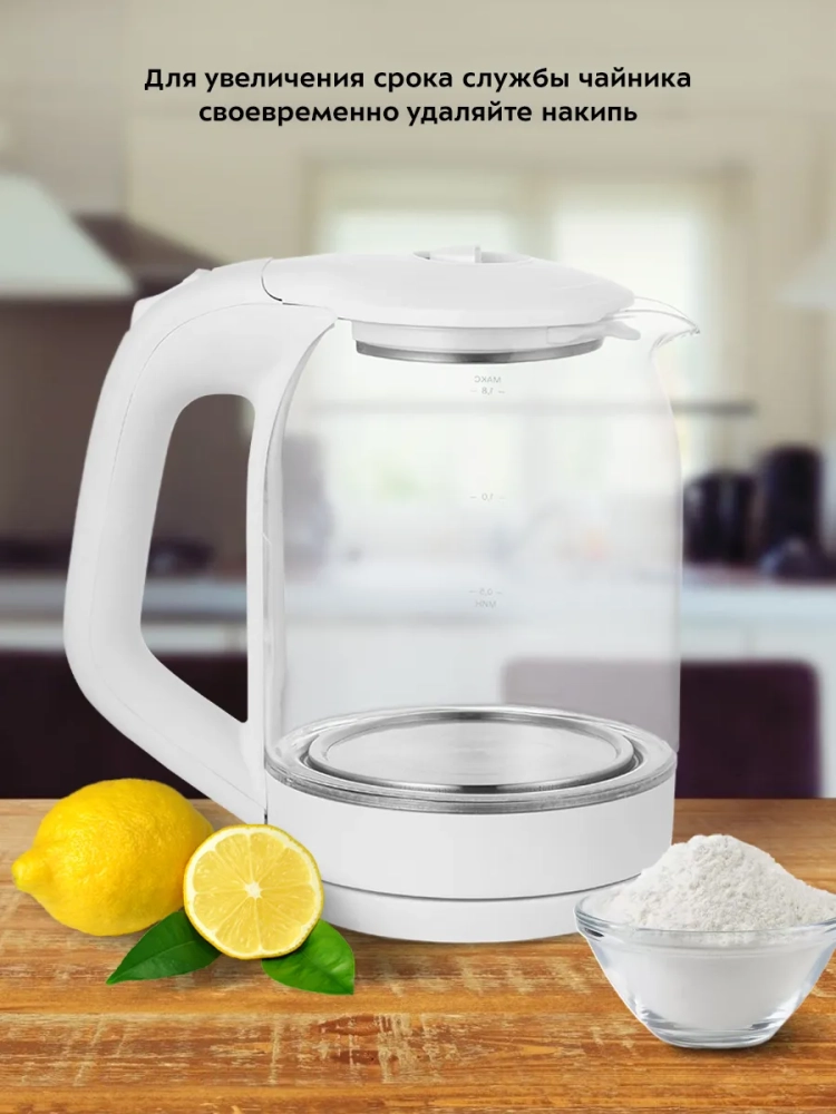 Электрический чайник Kitfort КТ-6169 предназначен для кипячения воды дома, в офисе, на даче. Корпус чайника выполнен из стекла и пластика. Крышка выполнена из сочетания пластика и металла, а подставка - из пластмассы. Мерная шкала находится на корпусе. Ручка чайника пластиковая, не нагревается и удобно лежит в руке. Внутренняя поверхность чайника состоит из стекла, благодаря чему вода не соприкасается с пластиком.Кнопка открывания крышки расположена на крышке, а кнопка включения - на ручке. При включении чайника загорается синяя подсветка, которая является индикатором работы.Нагревательный элемент (ТЭН) у этой модели чайника скрытый и находится в донной части. Сверху он закрыт специальной металлической пластиной из нержавеющей стали, благодаря которой исключается прямой контакт ТЭНа с водой. Такая конструкция препятствует образованию накипи, облегчает уход и значительно снижает шум при нагревании воды.Подставка с центральным контактом дает возможность располагать на ней чайник в любом положении, обеспечивая вращение на 360°. Снизу имеется отсек для хранения шнура, в который можно смотать излишки шнура электропитания, чтобы он не мешал на столе.Чайник автоматически отключается при закипании, имеет защиту от перегрева и от включения без воды.При закипании воды образующийся пар попадает в паропровод, проходит по нему и затем воздействует на термодатчик, который отключает чайник. Такая конструкция позволяет чайнику отключаться при закипании воды независимо от альтитуды (высоты над уровнем моря). Как известно, атмосферное давление уменьшается с увеличением высоты над уровнем моря, а температура кипения воды, в свою очередь, зависит от давления, так что высоко в горах вода может закипать уже при 80 °С. Таким образом, контроллер выключает чайник не при какой-то определенной температуре, а именно при закипании воды, независимо от того, при какой температуре она закипает.