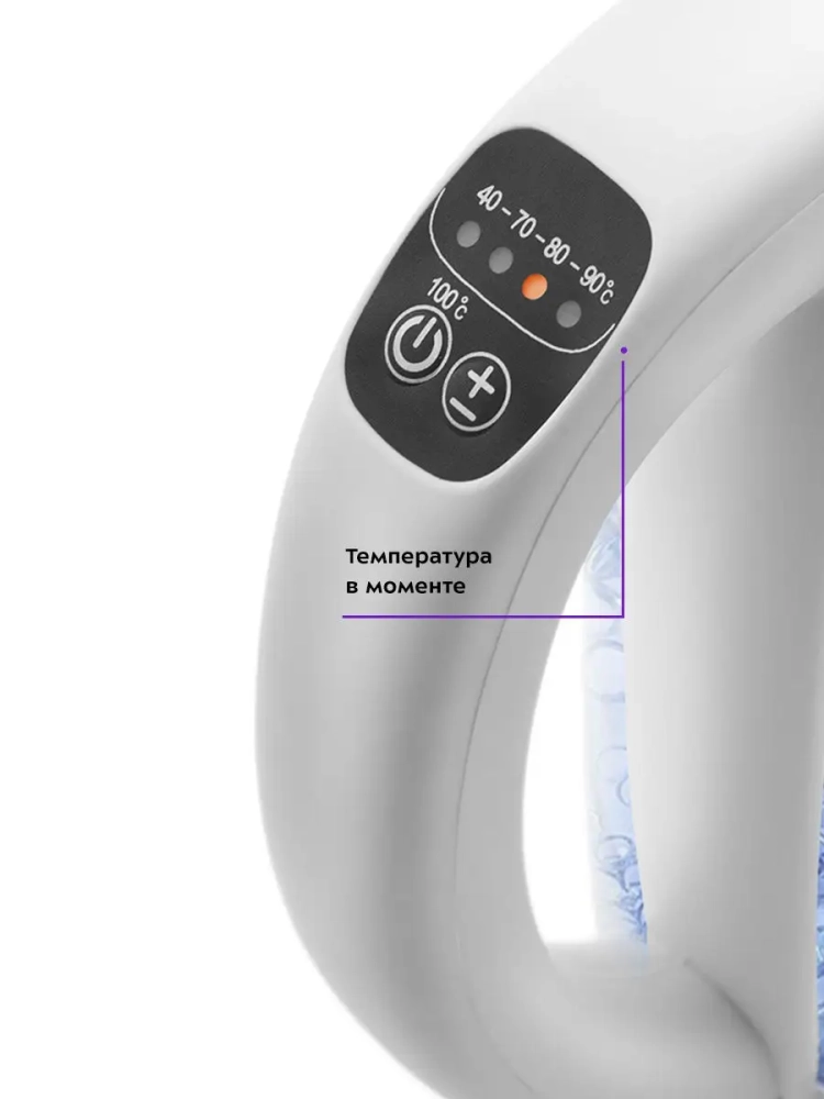 Электрический чайник с электронным терморегулятором Kitfort КТ-640 может не только вскипятить воду, но и нагреть ее до температуры 40, 70, 80 и 90 °С, что очень удобно при заваривании различных сортов чая. Температура 40 *С пригодится для приготовления детского питания. Чайник также оснащен функцией поддержания температуры. Температура воды контролируется встроенным в дно чайника термодатчиком.