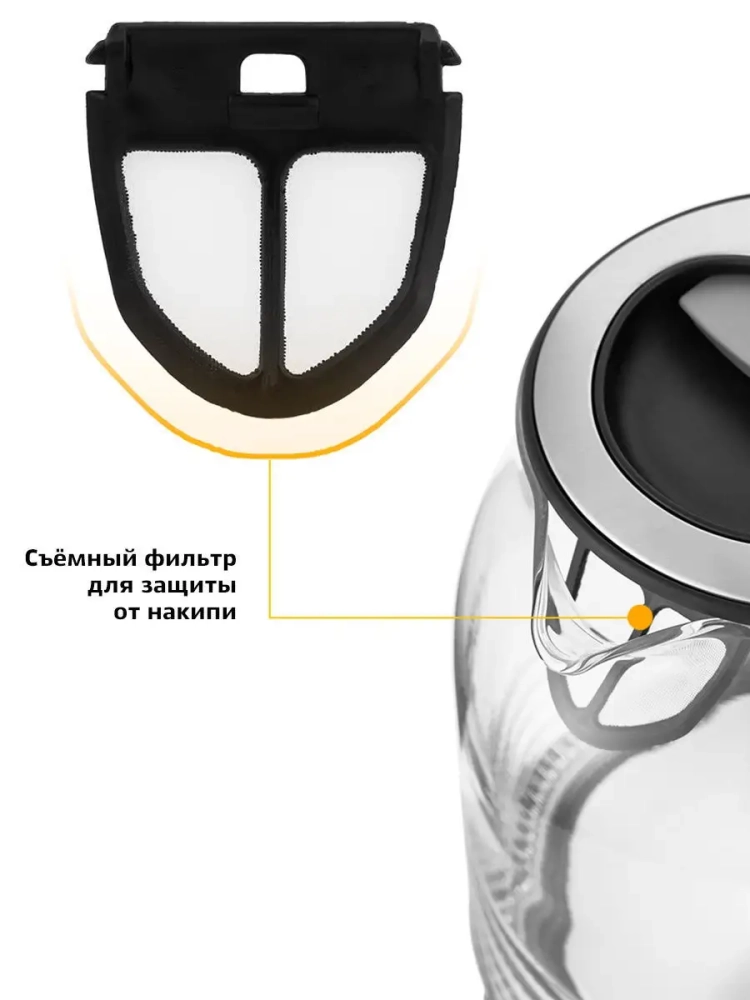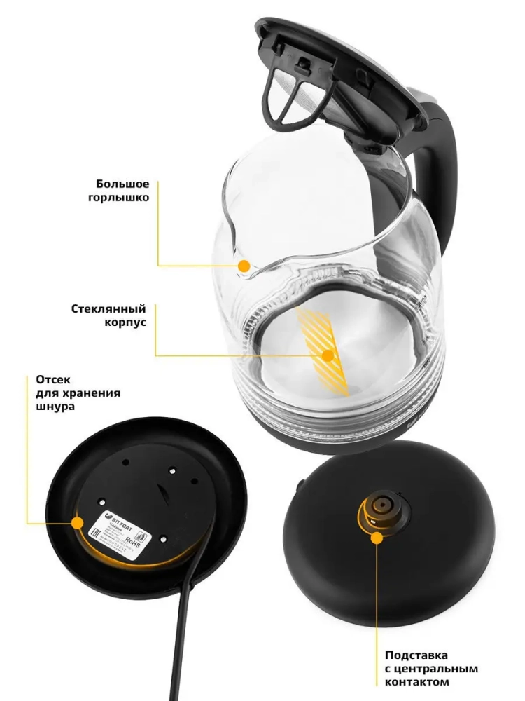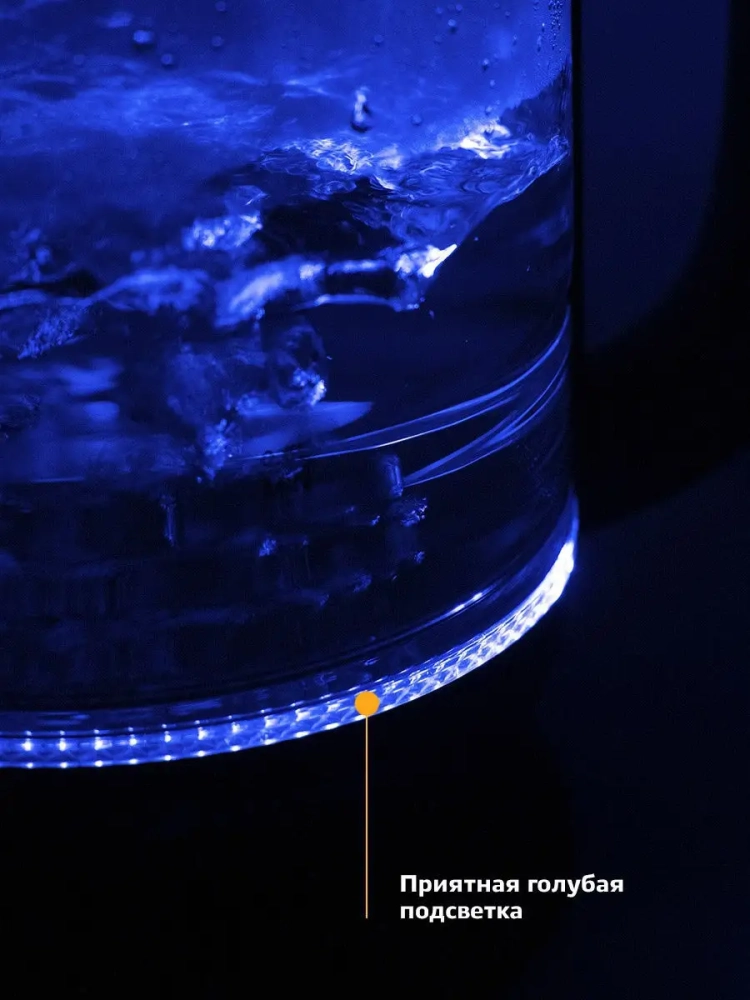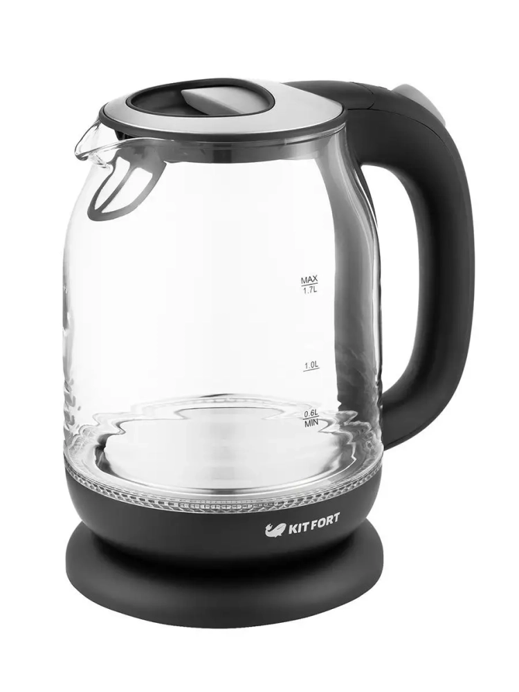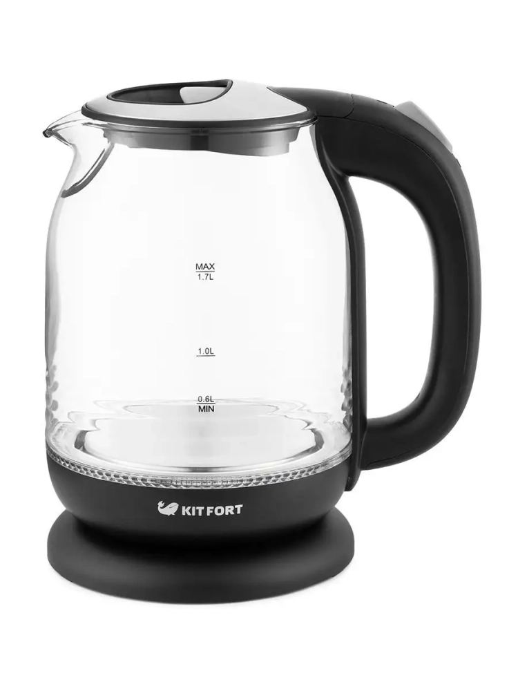 Электрический чайник Kitfort КТ-654 предназначен для кипячения воды дома, в офисе, на даче. Мощность чайника позволяет использовать его в домах со слабой проводкой. Корпус чайника выполнен из стекла, а крышка и подставка - из пластмассы. Мерная шкала нанесена на прозрачную часть корпуса. Большое горлышко чайника облегчает доступ внутрь при мытье и во время удаления накипи. Ручка чайника пластиковая, не нагревается и удобно лежит в руке.Кнопка открывания крышки расположена сверху на крышке, а кнопка включения - на ручке. При включении чайника загорается синяя подсветка, которая является индикатором работы и одновременно художественно подсвечивает кипящую воду. Снизу имеется отсек для хранения шнура, в который можно смотать излишки шнура электропитания, чтобы он не мешался на столе.Чайник автоматически отключается при закипании, имеет защиту от перегрева и от включения без воды.