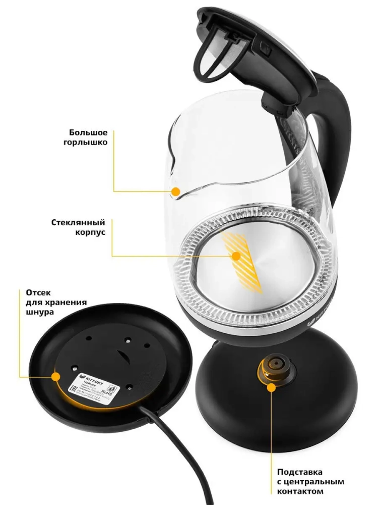 Корпус чайника выполнен из стекла, а крышка и подставка — из пластмассы. Мерная шкала нанесена на прозрачную часть корпуса. Большое горлышко чайника облегчает доступ внутрь при мытье и во время удаления накипи. Ручка чайника пластиковая, не нагревается и удобно лежит в руке.