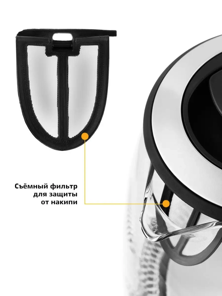 Нагревательный элемент (ТЭН) у этой модели чайника скрытый и находится в донной части. Сверху он закрыт специальной металлической пластиной из нержавеющей стали, благодаря которой исключается прямой контакт ТЭНа с водой. Такая конструкция препятствует образованию накипи, облегчает уход и значительно снижает шум при нагревании воды.