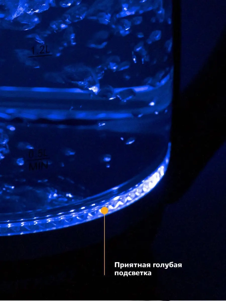 Кнопка открывания крышки расположена сверху на крышке, а кнопка включения — на ручке. При включении чайника загорается синяя подсветка, которая является индикатором работы и одновременно художественно подсвечивает кипящую воду.
