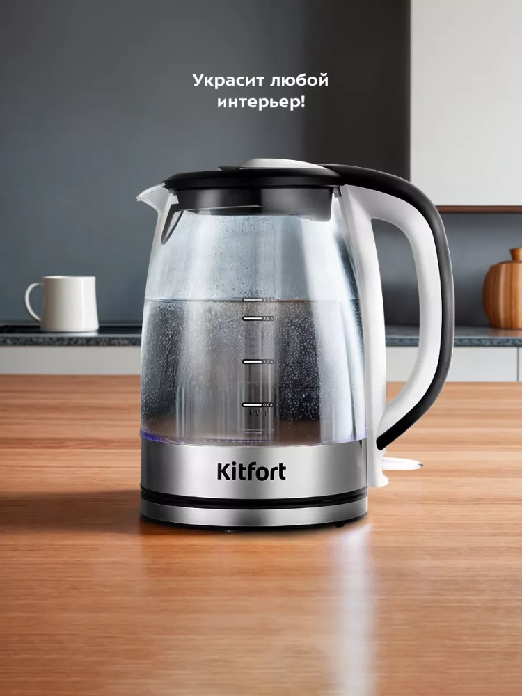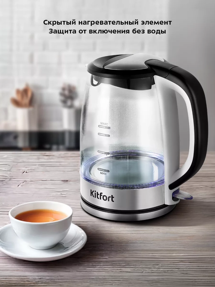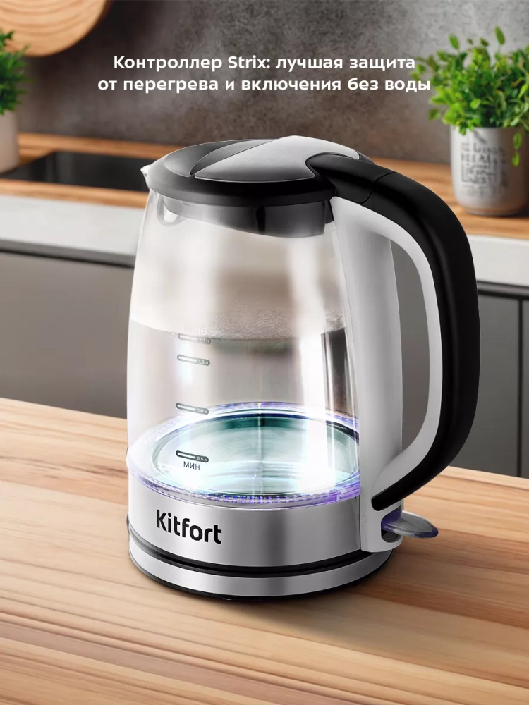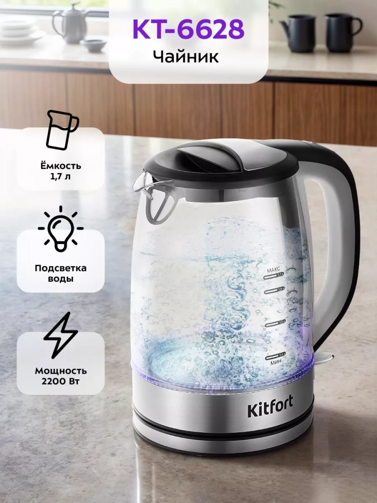 Электрический чайник Kitfort КТ-6628 — это идеальное бытовое решение для кипячения воды дома, в офисе или на даче. Этот стеклянный электрочайник с подсветкой и объемом 1,7 литра сочетает в себе стильный дизайн и функциональность. Корпус выполнен из нержавеющей стали и стекла, что обеспечивает долговечность и безопасность использования. Металлический корпус не только придает изделию современный вид, но и гарантирует отсутствие контакта воды с пластиком. Чайник оснащен удобной пластиковой ручкой, которая не нагревается во время работы, обеспечивая комфортное использование. Подсветка переключателя служит индикатором работы устройства, добавляя эстетическую привлекательность вашему кухонному пространству. Скрытый нагревательный элемент (нагреватель ТЭН) расположен в донной части чайника, что способствует равномерному нагреву воды. Подставка с центральным контактом позволяет вращать чайник на 360°, а отсек для хранения шнура помогает избежать беспорядка на столе. Функция автоотключения активируется при закипании или снятии чайника с подставки, предотвращая перегрев и включение без воды. Умная конструкция паропровода направляет пар к термодатчику для точного отключения независимо от высоты над уровнем моря — будь то у подножия горы или высоко в горах. Этот электрочайник китфорт станет надежным помощником на вашей кухне благодаря своей безопасности и продуманности конструкции.