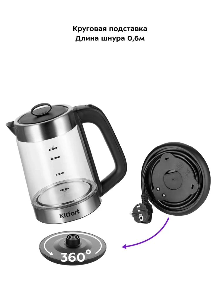 Центральный контакт для чайника на базе дает возможность ставить чайник на нее в любом положении, обеспечивая вращение на 360°. Чайник имеет защиту от перегрева и защиту от включения без воды.