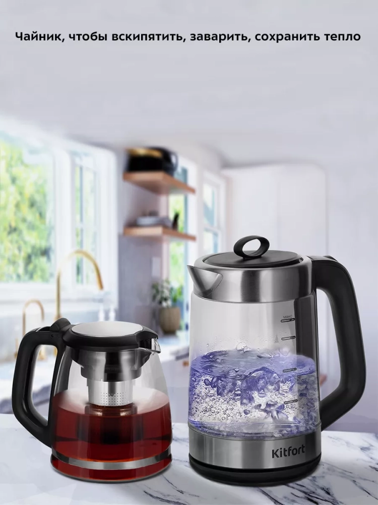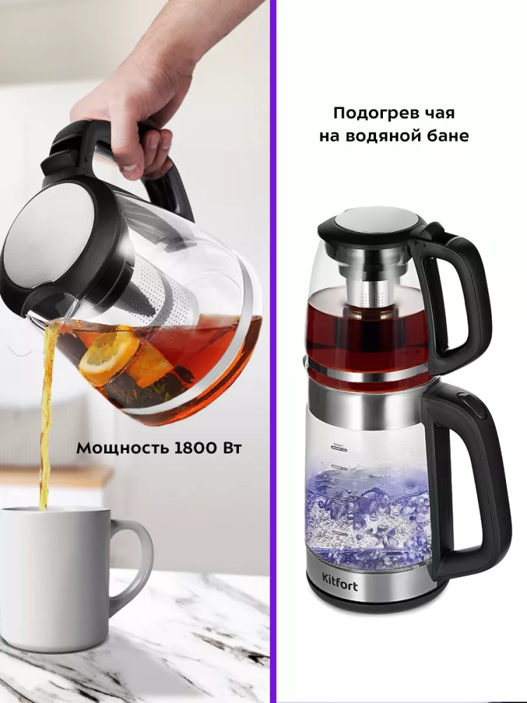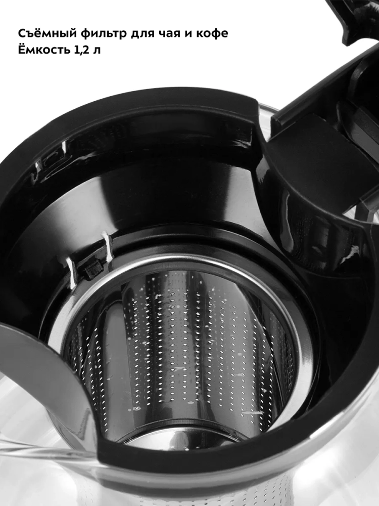 Заварочный чайник изготовлен из термостойкого стекла и имеет съемный фильтр для чая или кофе. Заварочный чайник можно установить сверху на только закипевший чайник, и благодаря «водяной бане» напиток в заварочном чайнике дольше останется теплым. Также вы можете подогреть напиток и во время нагрева воды в чайнике, установив заварочный чайник вместо крышки чайника.