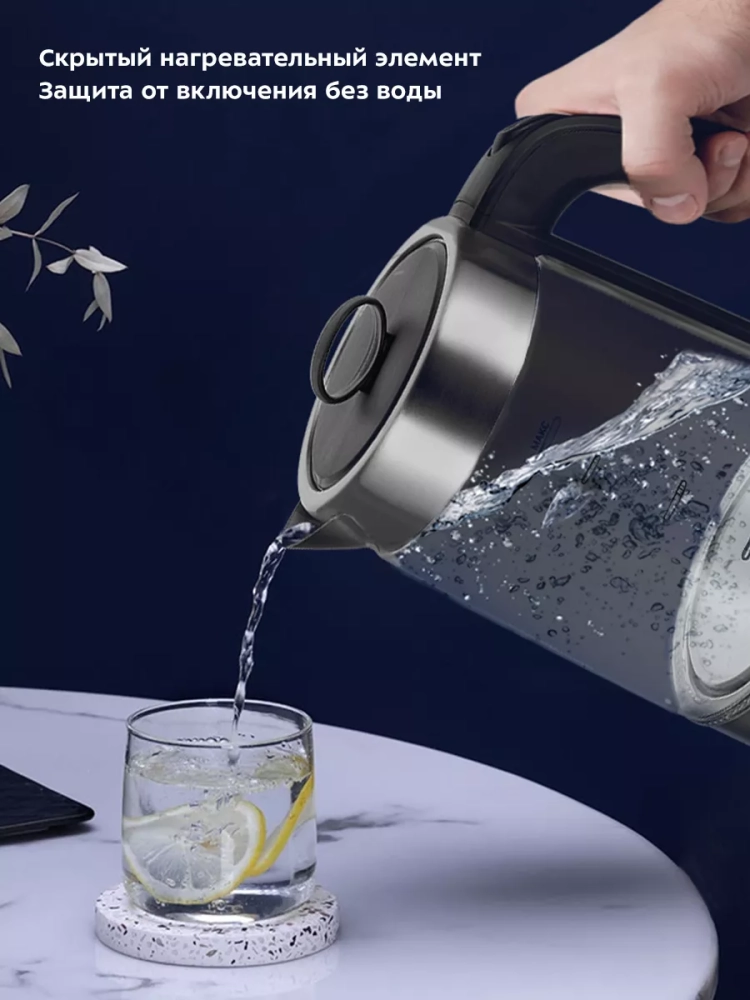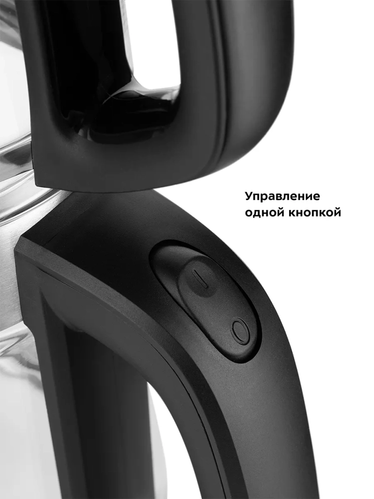 Корпус чайника и крышка выполнены из стекла и нержавеющей стали. Мерная шкала нанесена на стеклянную часть корпуса. Ручка чайника пластиковая, что позволяет комфортно и удобно держать чайник в руке, не боясь, что он выскользнет.