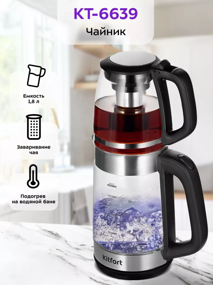 Чайник «2 в 1» Kitfort КТ-6639 состоит из чайника емкостью 1,8 л, заварочного чайника с фильтром для заварки емкостью 1,2 л и базы. Чайник «2 в 1» поможет вам не только вскипятить воду, но и заварить чай или кофе, а также сохранять готовый напиток теплым.