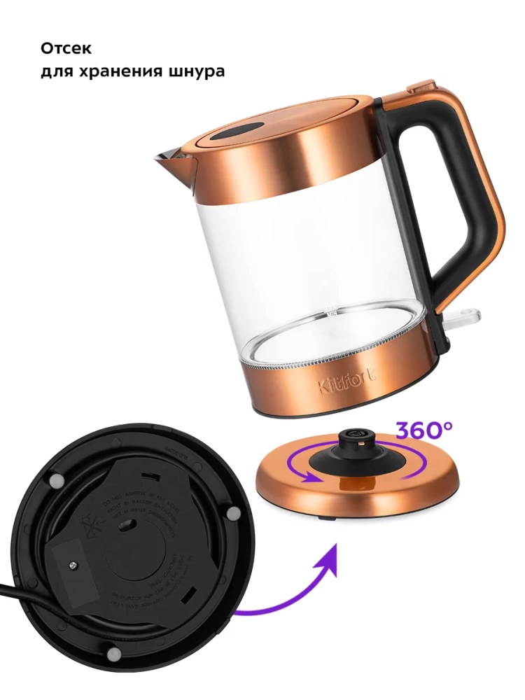 Подставка с центральным контактом дает возможность ставить чайник на нее в любом положении, обеспечивая вращение на 360°. Снизу имеется отсек для хранения шнура, в который можно смотать излишки шнура электропитания, чтобы он не мешался на столе. Ножки подставки противоскользящие.
