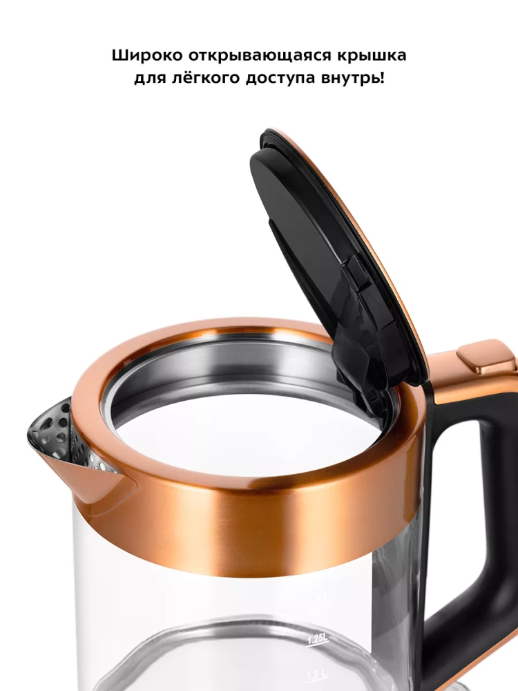 Корпус чайника выполнен из стекла, а крышка и подставка — из сочетания пластмассы и нержавеющей стали. Мерная шкала нанесена на прозрачную часть корпуса. Большое горлышко чайника облегчает доступ внутрь при мытье и во время удаления накипи. Ручка чайника пластиковая, не нагревается и удобно лежит в руке.