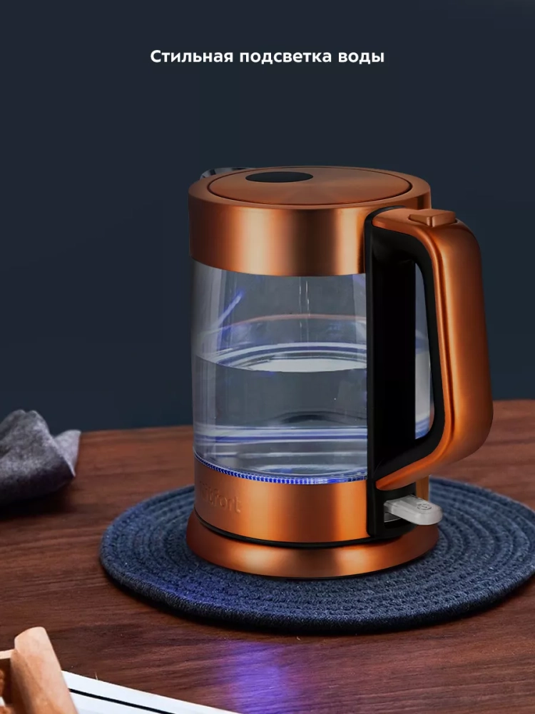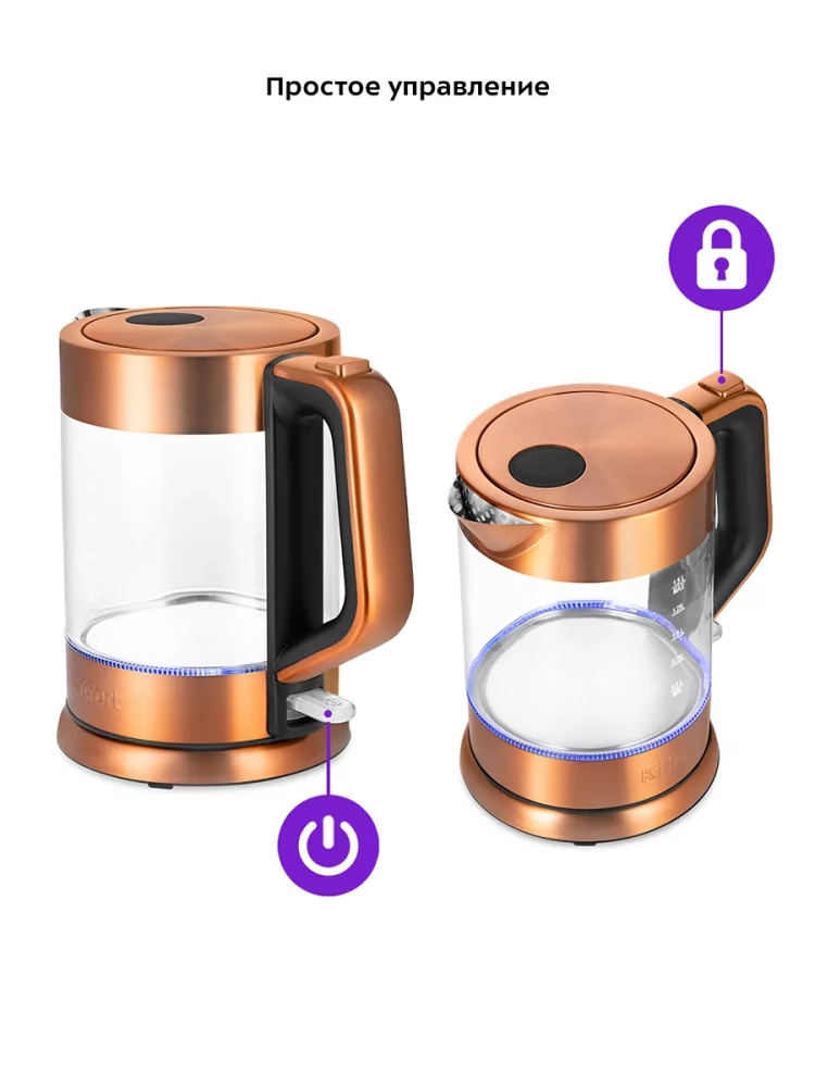 Кнопка открывания крышки расположена сверху на ручке, а кнопка включения — внизу. При включении чайника загорается синяя подсветка, которая является индикатором работы и одновременно художественно подсвечивает кипящую воду.