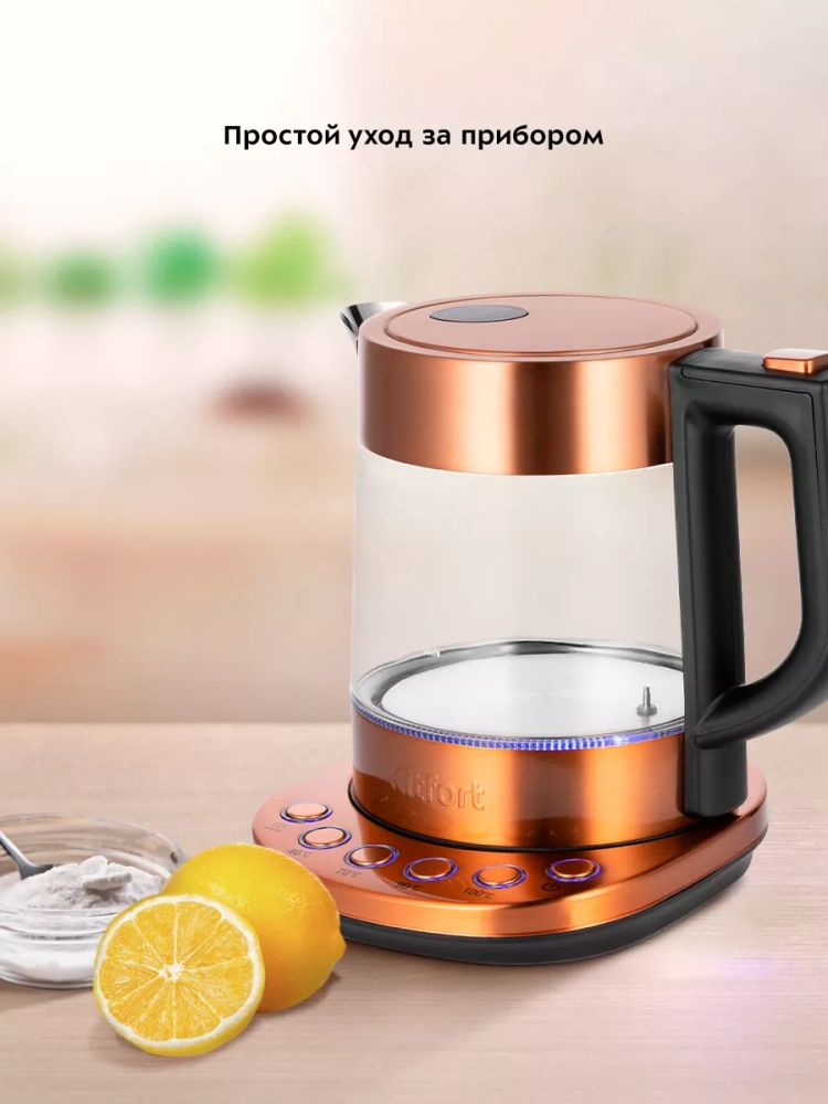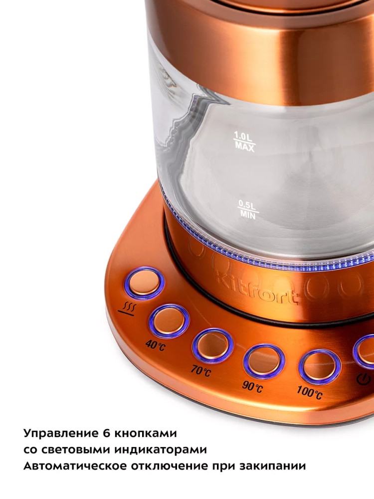 Электрический чайник с терморегулятором Kitfort КТ-6658 может не только вскипятить воду, но и нагреть ее до температуры от 40, 70 и 90 °С, что очень удобно при заваривании различных сортов чая и подогрева детского питания. Чайник также оснащен функцией поддержания температуры. Температура воды контролируется термодатчиком, встроенным в дно чайника.