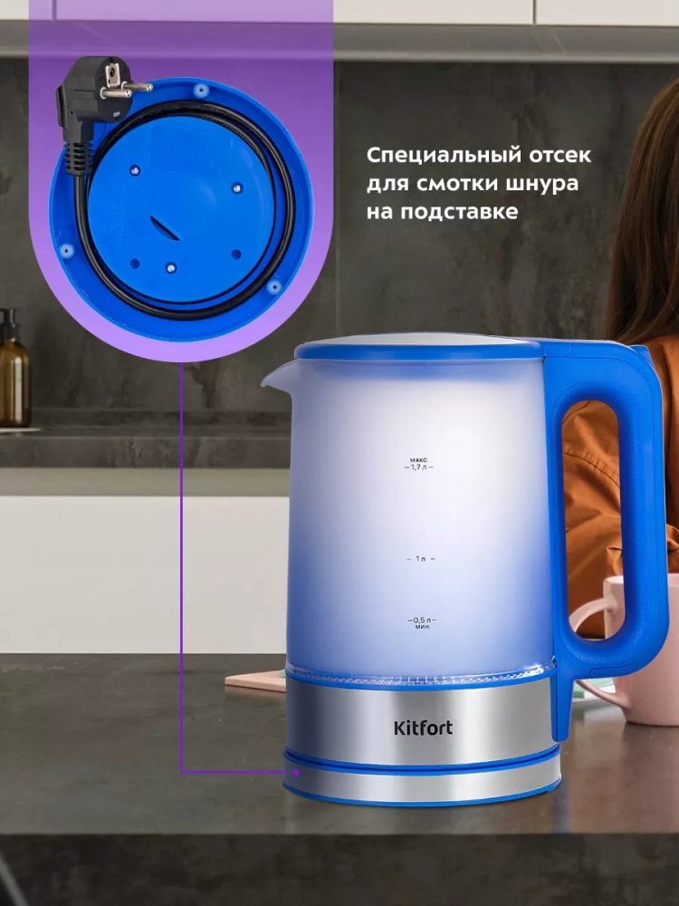 Подставка с центральным контактом дает возможность располагать на ней чайник в любом положении, обеспечивая вращение на 360°. Снизу имеется отсек для хранения шнура, в который можно смотать излишки шнура электропитания, чтобы он не мешал на столе.