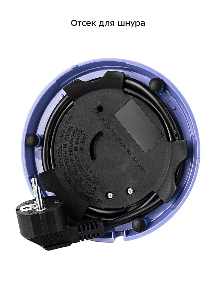 Подставка с центральным контактом дает возможность располагать на ней чайник в любом положении, обеспечивая вращение на 360°. Снизу имеется отсек для хранения шнура, в который можно смотать излишки шнура электропитания, чтобы он не мешал на столе.