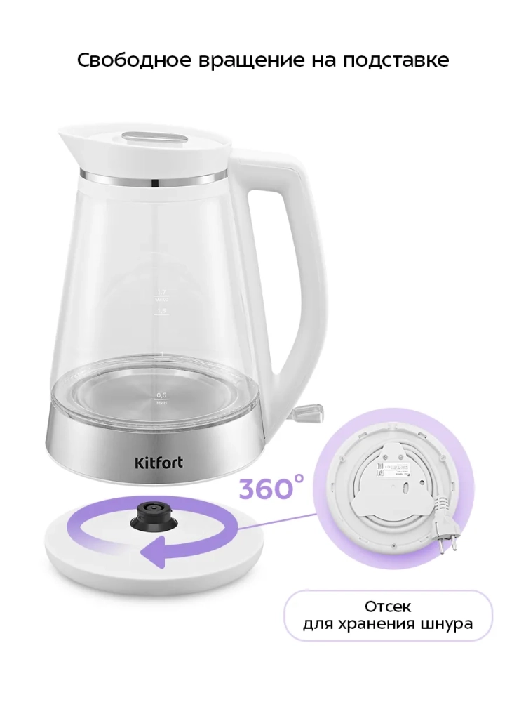 Подставка с центральным контактом дает возможность располагать на ней чайник в любом положении, обеспечивая вращение на 360°. Силиконовые ножки подставки делают ее более устойчивой.
