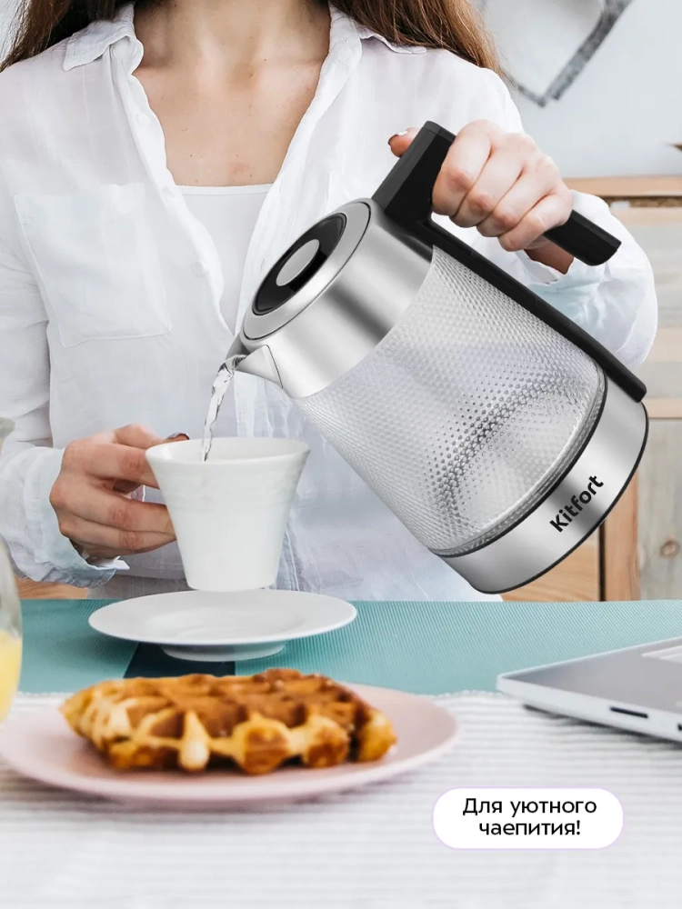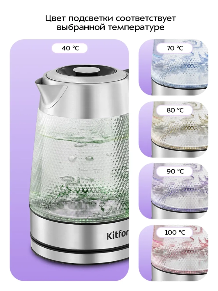 Электрический чайник с электронным терморегулятором Kitfort КТ-6697 может не только вскипятить воду, но и нагреть ее до 40, 70, 80 и 90 °С, что очень удобно при заваривании различных сортов чая. Чайник также оснащен функцией поддержания температуры в течение 2 часов. Температура воды контролируется встроенным термодатчиком.