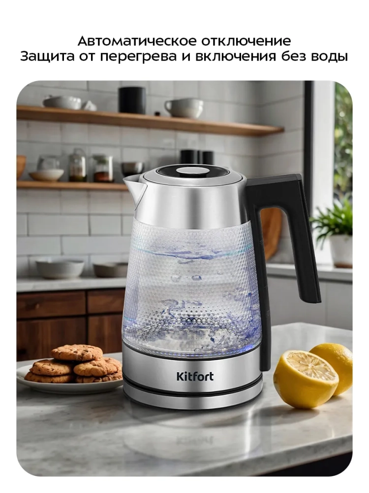 Чайник автоматически отключается при закипании, имеет защиту от перегрева и от включения без воды.