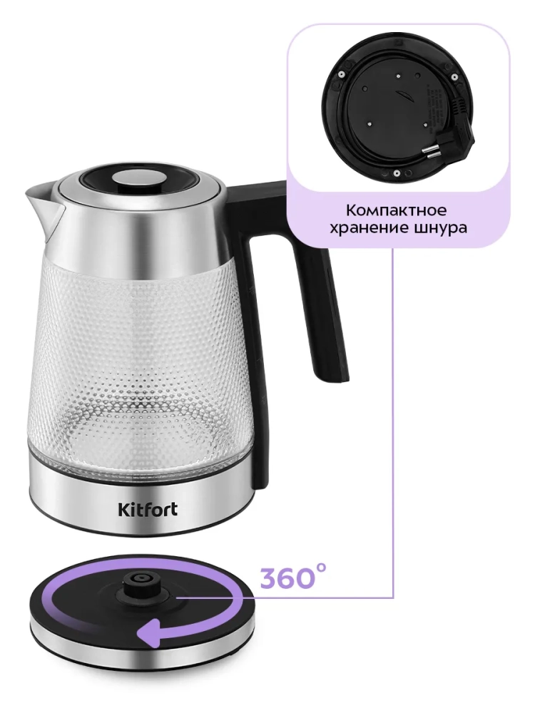 Подставка с центральным контактом дает возможность располагать на ней чайник в любом положении, обеспечивая вращение на 360°.