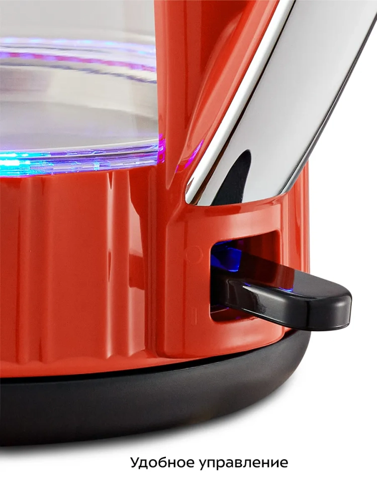 Корпус чайника выполнен из сочетания стекла и пластика. Ручка чайника сделана из пластика, она не нагревается и удобно лежит в руке. Кнопка включения расположена под ручкой. При включении загорается индикатор, встроенный в корпус.