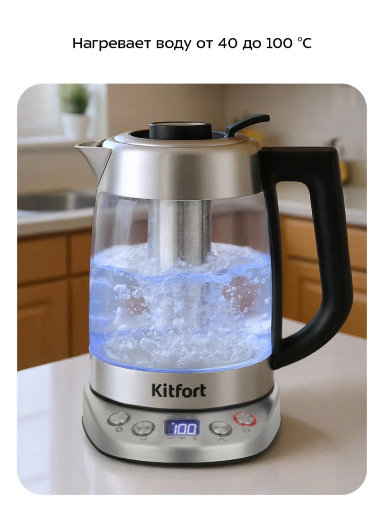 Электрический чайник Kitfort КТ-6796 может не только вскипятить воду, но и нагреть ее до температуры 40–95 °С с шагом 5 °С, что очень удобно при заваривании различных сортов чая и приготовлении детского питания.