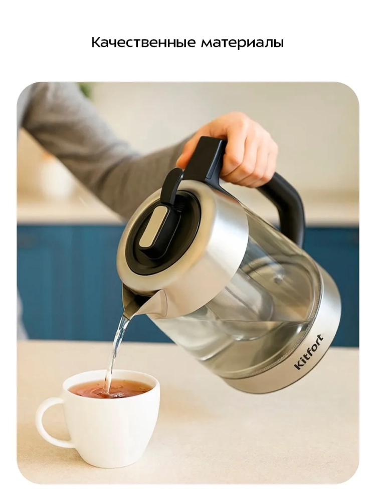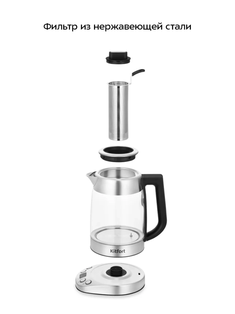 Корпус чайника выполнен из стекла и нержавеющей стали. Мерная шкала нанесена на стеклянную часть корпуса. Пластиковая ручка чайника удобно лежит в руке, не скользит и не нагревается благодаря особенностям конструкции. Чайник оснащен фильтром от накипи. В комплект также входит заварочный фильтр из нержавеющей стали для чая или кофе. Подставка с центральным контактом дает возможность располагать на ней чайник в любом положении, обеспечивая вращение на 360°.