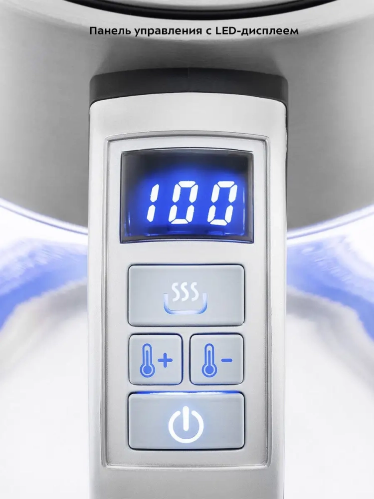 Ручка чайника пластиковая. Она не нагревается и удобно лежит в руке. На ручке расположена панель управления чайником и LED дисплей.