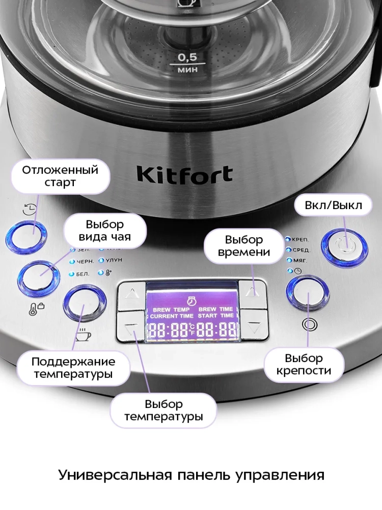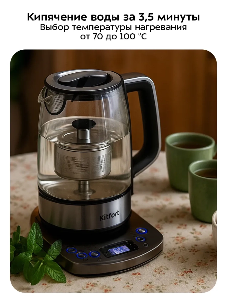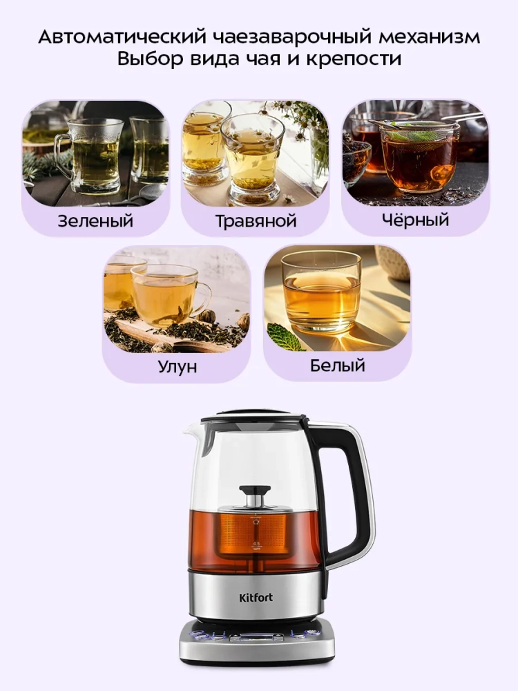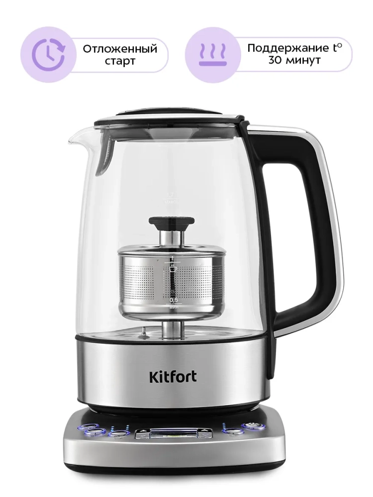 Электрический чайник Kitfort КТ-8717 может не только вскипятить воду, но и нагреть ее до температуры 70–95 °С с шагом 5 °С, что очень удобно при заваривании различных сортов чая. Время заваривания настраивается от 0 до 10 минут с шагом 30 секунд.