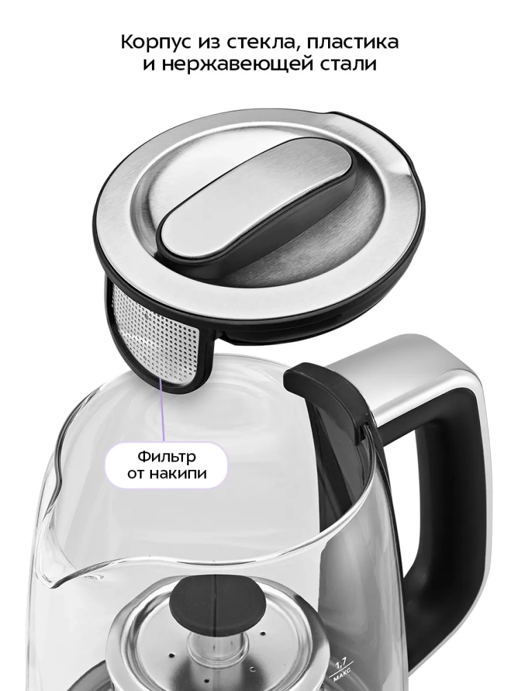Корпус чайника выполнен из стекла, пластика и нержавеющей стали. Мерная шкала нанесена на стеклянную часть корпуса.