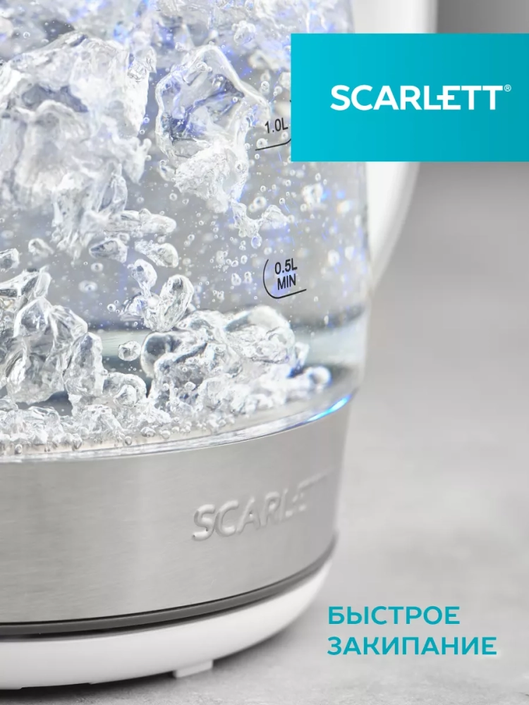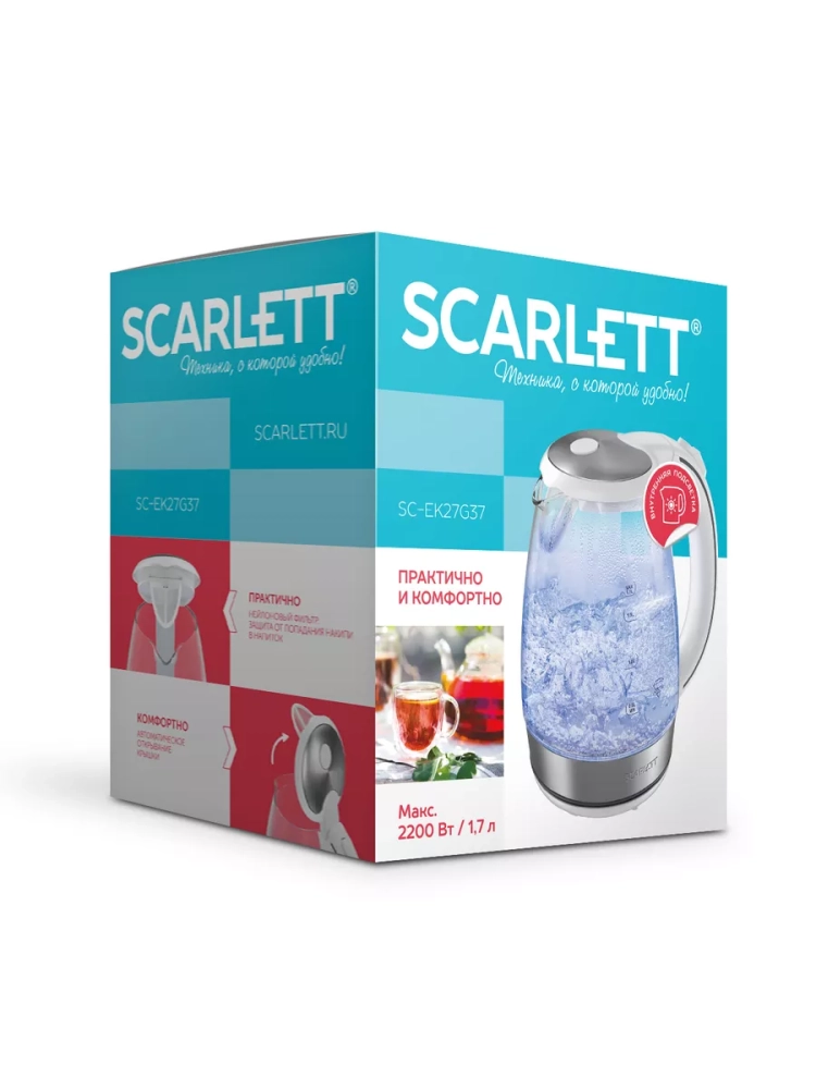 Электрический чайник Scarlett **имеет стильный дизайн, прост в использовании, надёжен и безопасен. Благодаря подсветке корпуса чайником удобно пользоваться при слабом освещении или в темноте.**Объём чайника составляет 1.7 литра. Индикатор уровня воды, расположенный с двух сторон, позволит быстро понять, сколько воды ещё осталось в чайнике.Шнур удобно убирается в специальный отсек в базе прибора. Чайник автоматически отключается при закипании, что делает его особенно удобным и безопасным, позволяет сэкономить электроэнергию. Также чайник оборудован защитой от включения без воды.