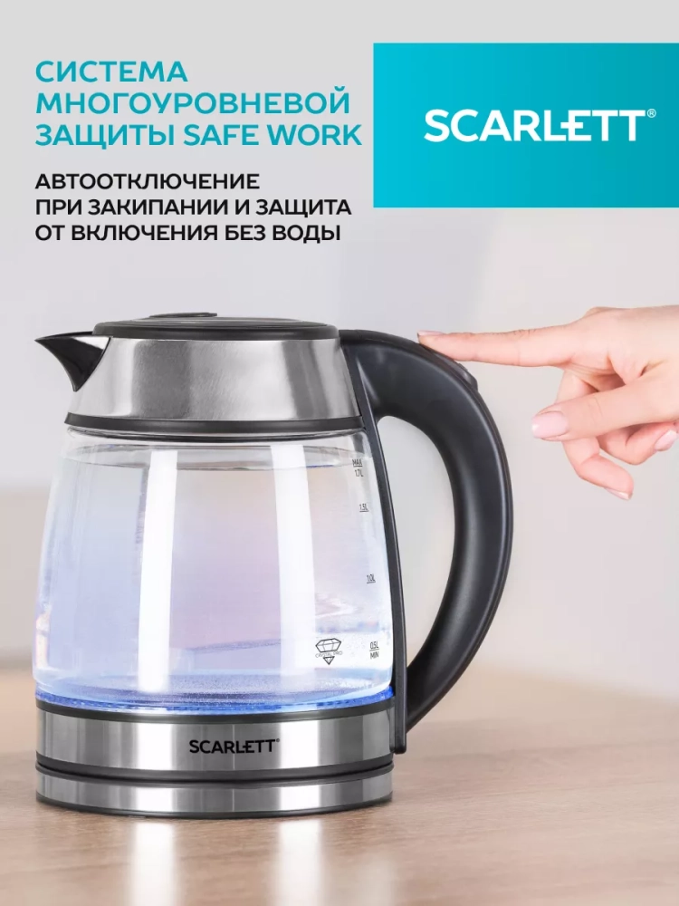 Scarlett SC-EK27G54 – электрический чайник мощностью 1800 Вт и объемом 1.7 л оснащён автоматической системой открывания крышки.