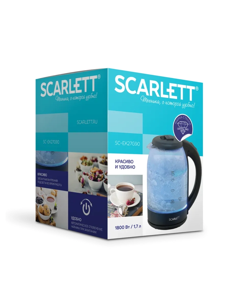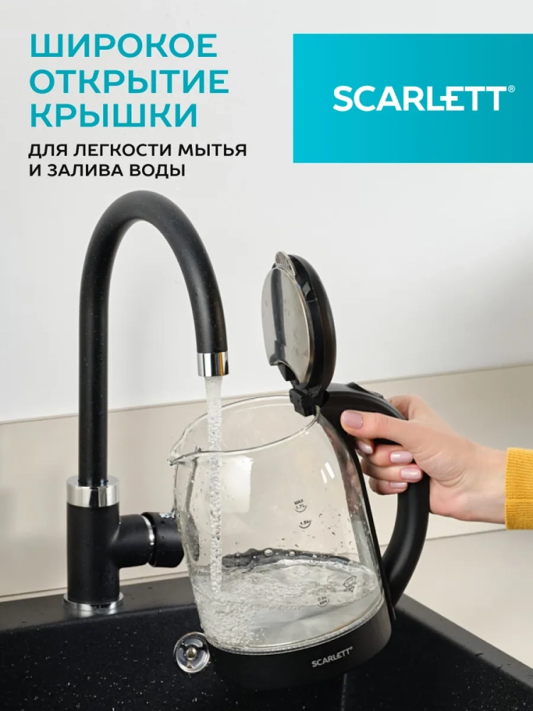 Электрический чайник SC-EK27G90 объемом 1.7 л оснащён традиционной системой открытия крышки.Эргономичная ручка, закрытый нагревательный элемент сделают эксплуатацию прибора еще проще и комфортнее. Внутренняя подсветка позволит наблюдать за завораживающим процессом кипячения.Классический черный цвет корпуса позволит прибору вписаться в любой интерьер кухни.