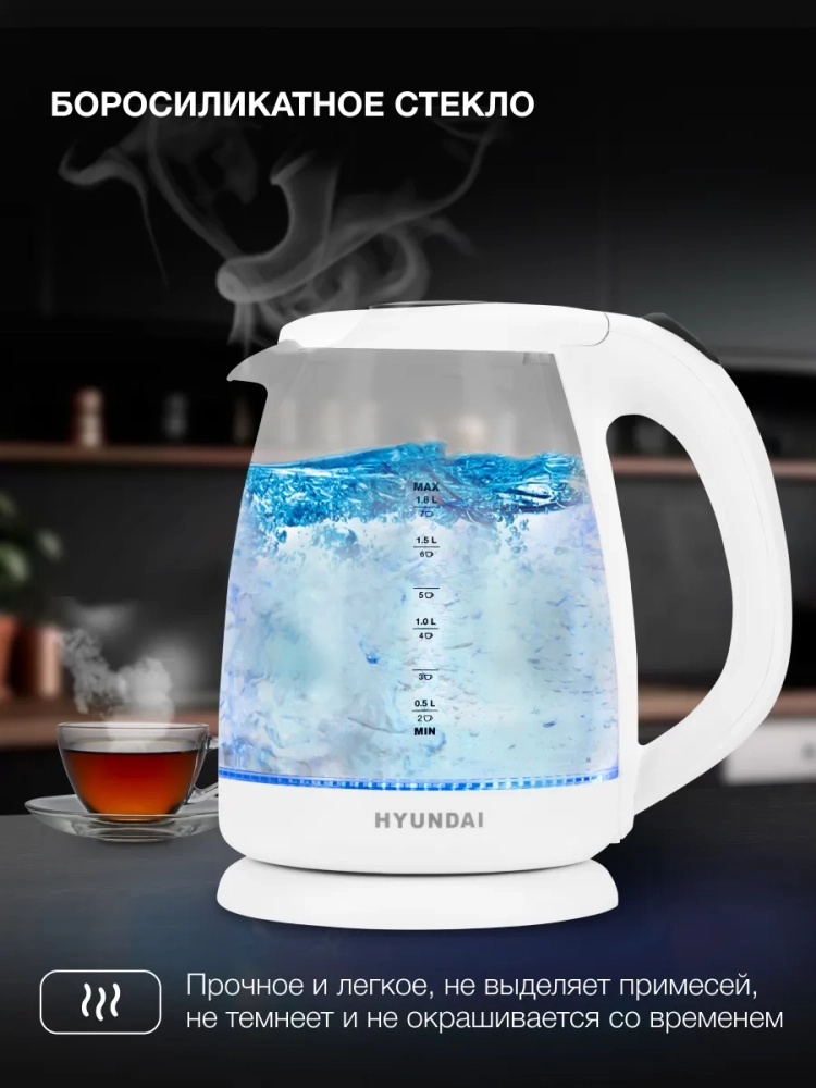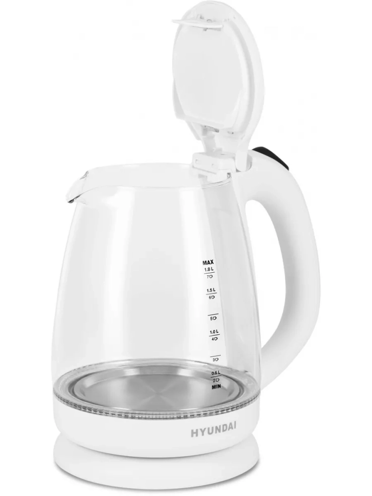 Чайник электрический Hyundai HYK-G2001 белый/серый, объём 1.8л, мощность 2200Вт, материал корпуса: стекло/пластик