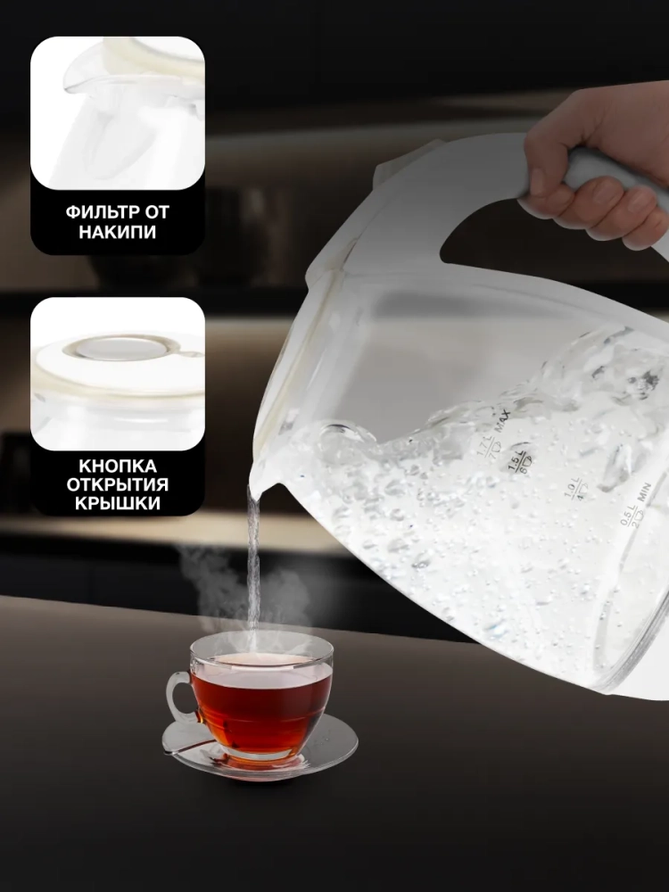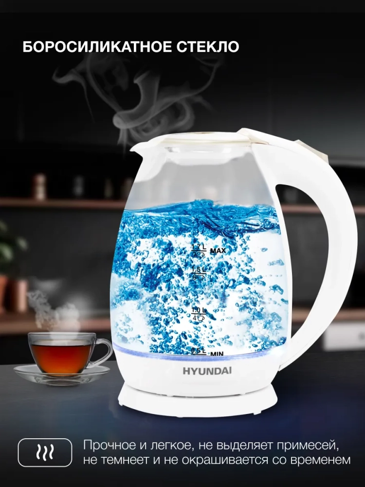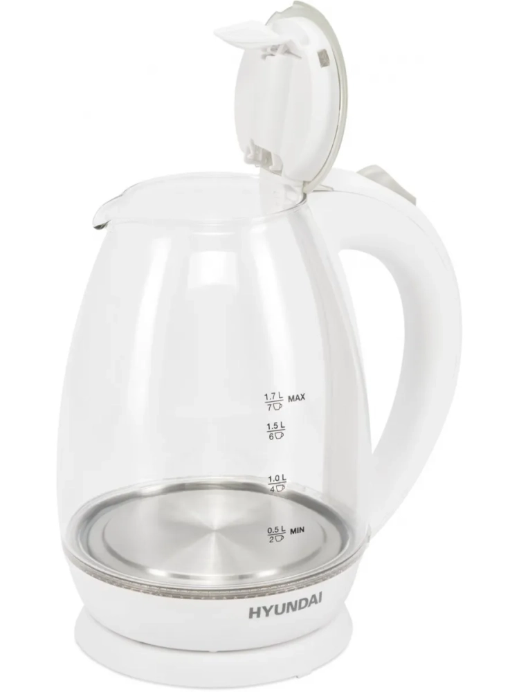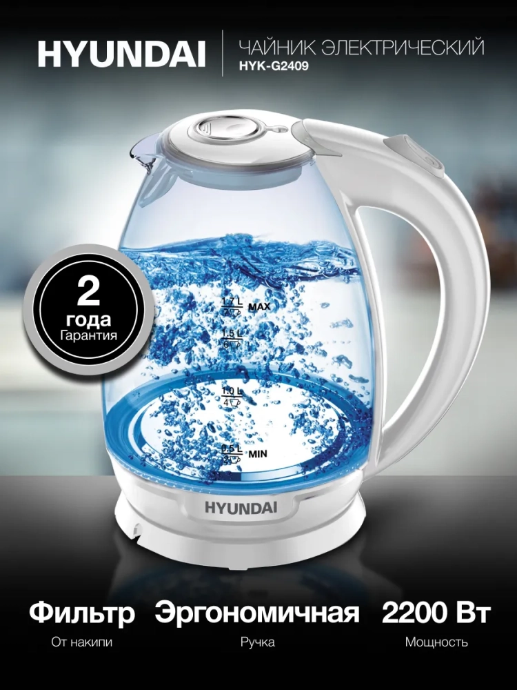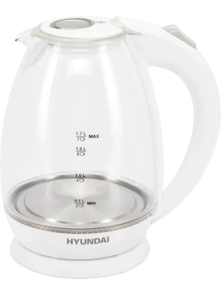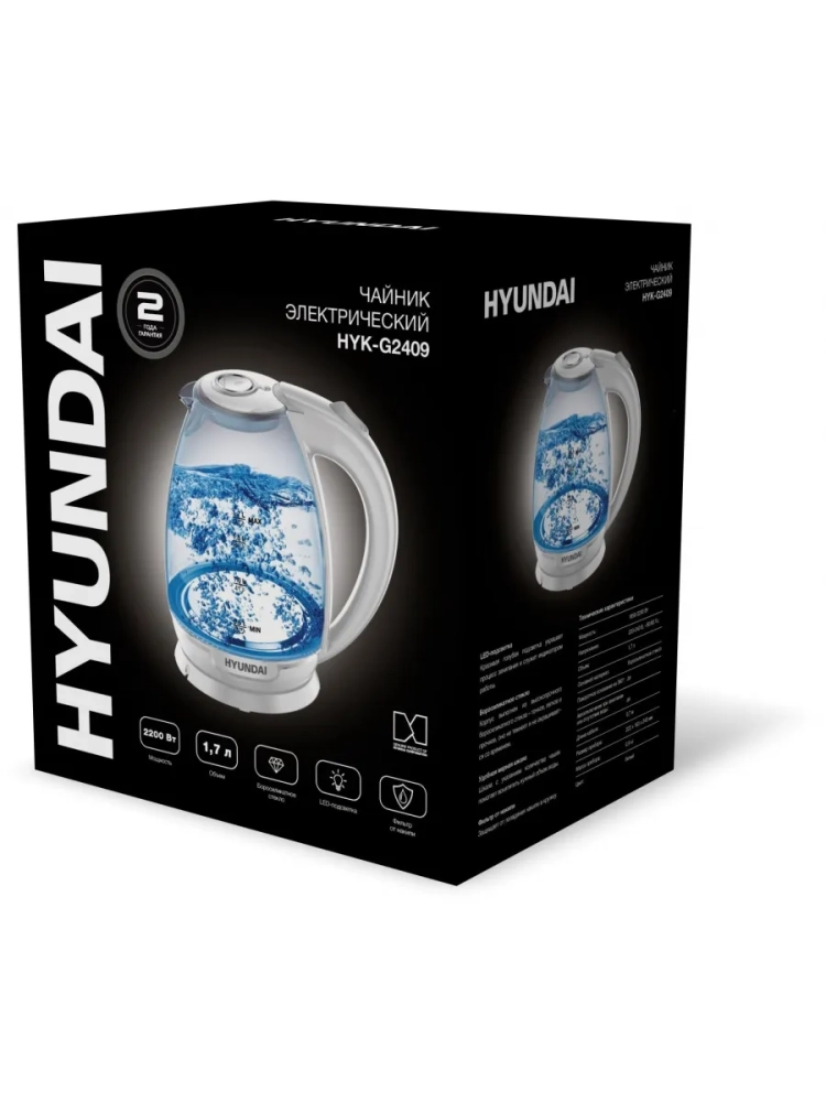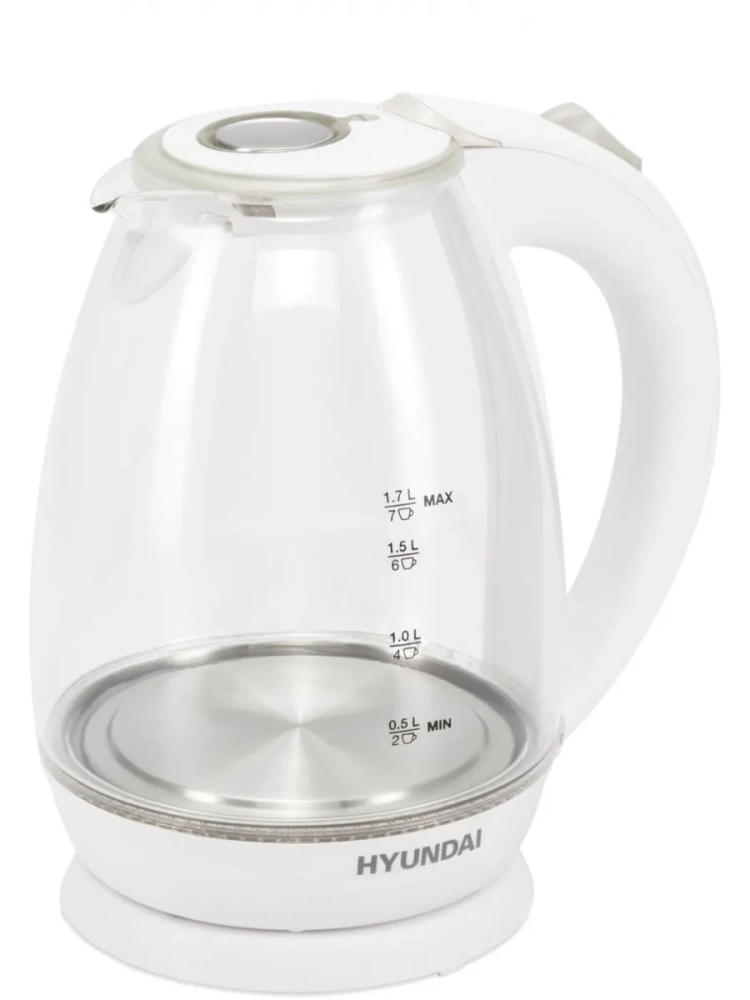 Чайник электрический Hyundai HYK-G2409 белый/серебристый, объём 1.7л, мощность 2200Вт, материал корпуса: стекло/пластик.
